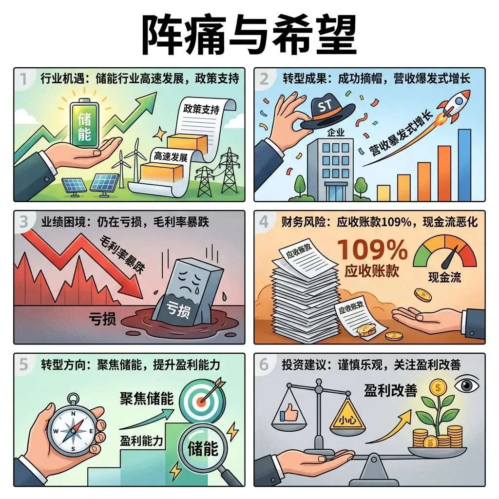 好消息:成功摘帽从*ST变正常,储能转型见效营收爆发,获行业奖项。坏消息:仍在亏损毛利率暴跌,应收账款109%钱收不回来,现金流暴跌424%资金紧张。