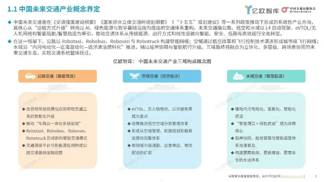 未来交通将以陆、空、水多域协同组成的立体生态取代传统单线运输网络,公路智能驾驶、低空飞行网络与智慧航运加速联动,形成多层级运力体系,产业竞争也将从单一“产品”竞争,升级为围绕“产品、服务、算力、能源”的全链路协同竞争,推动交通体系全面升级。