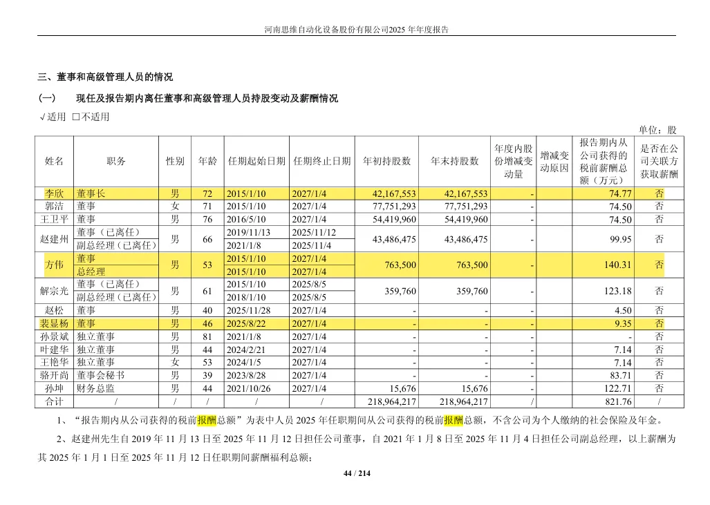 新任总经理裴显杨(46岁):2025年8月才被补选为董事,所以只领了9.35万元(因为他只干了几个月)。