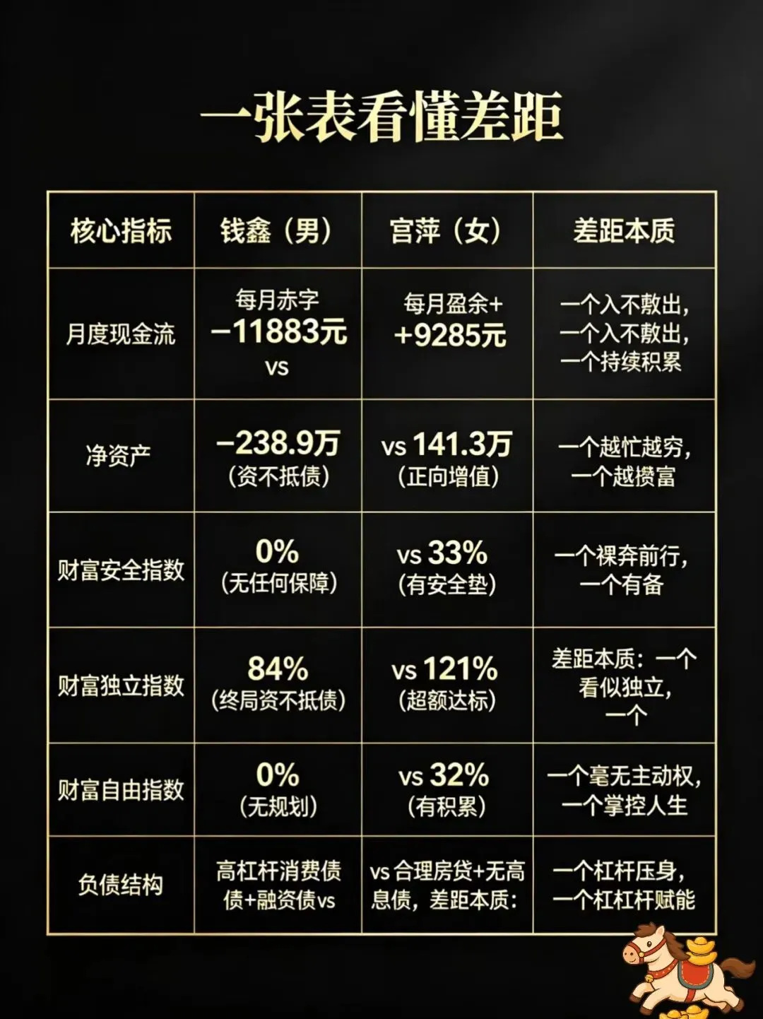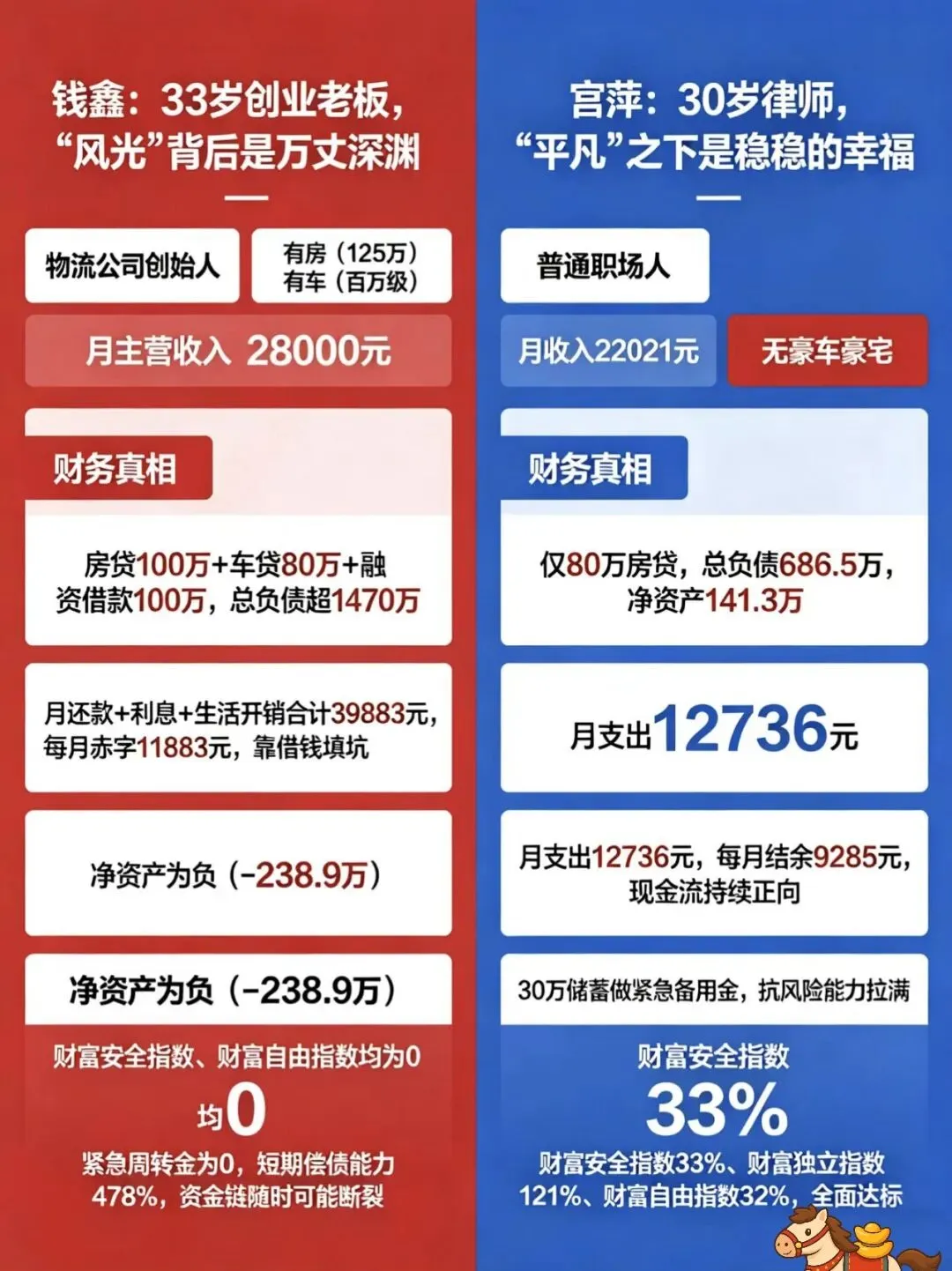 净资产 -238.9万(资不抵债) 141.3万(正向增值) 一个越忙越穷,一个越攒越富