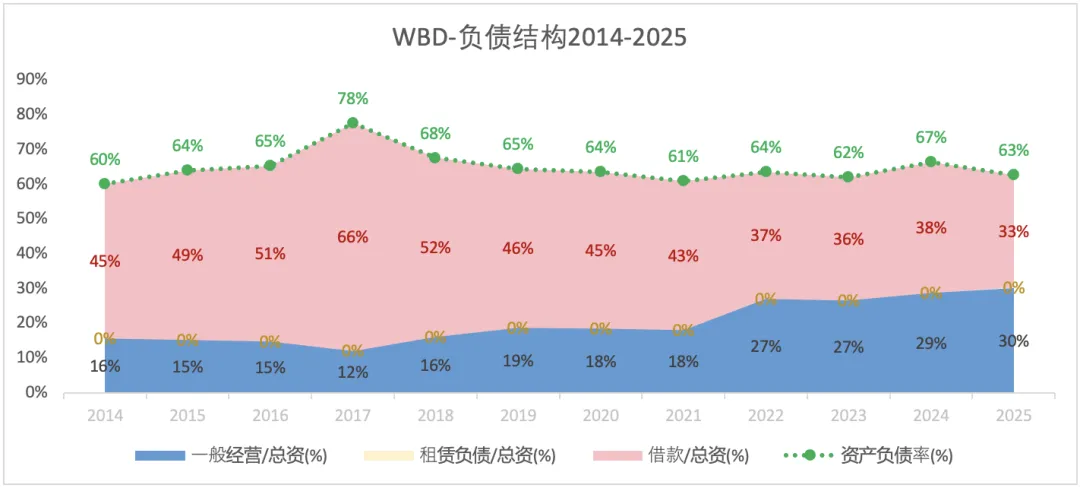 资产负债率: 2017年达到峰值78%,2021年后逐步回落至60%-65%区间,2025年为63%,但仍处于较高水平。