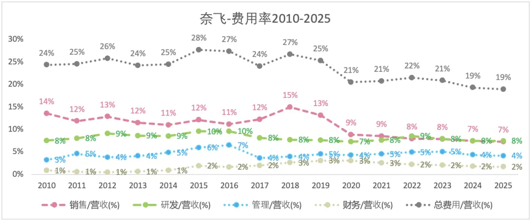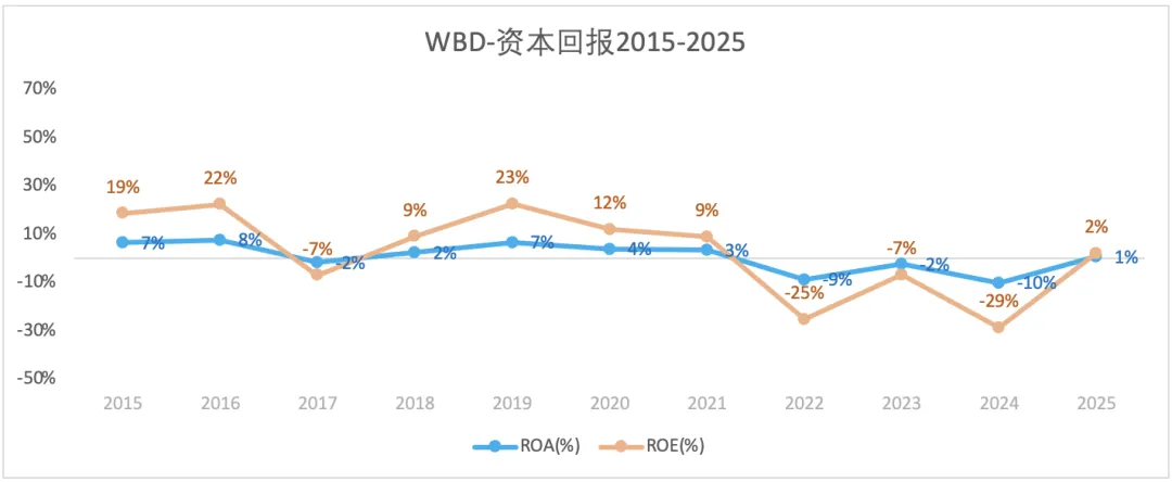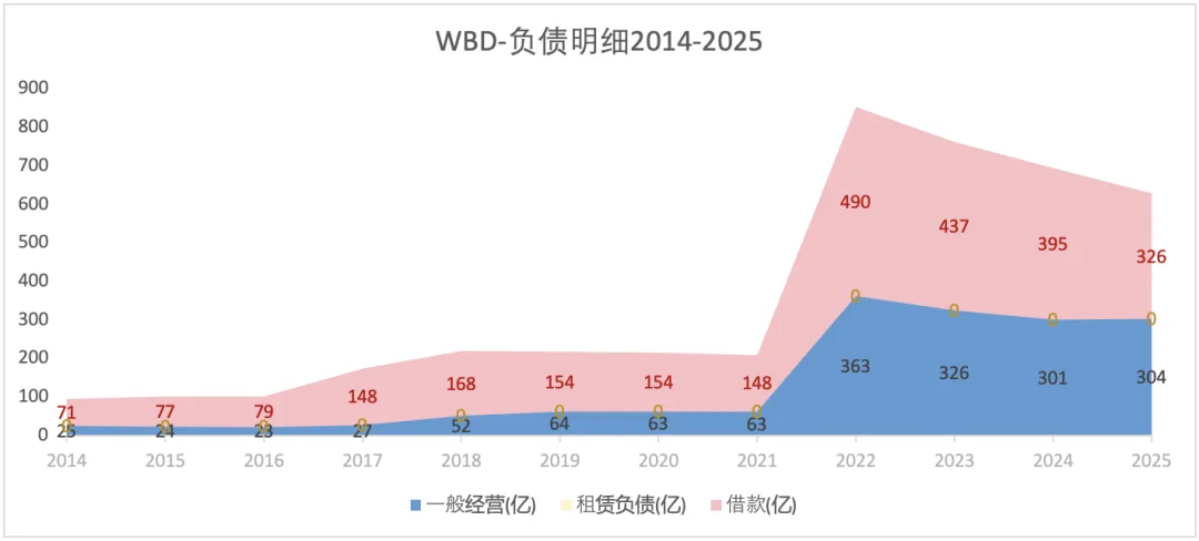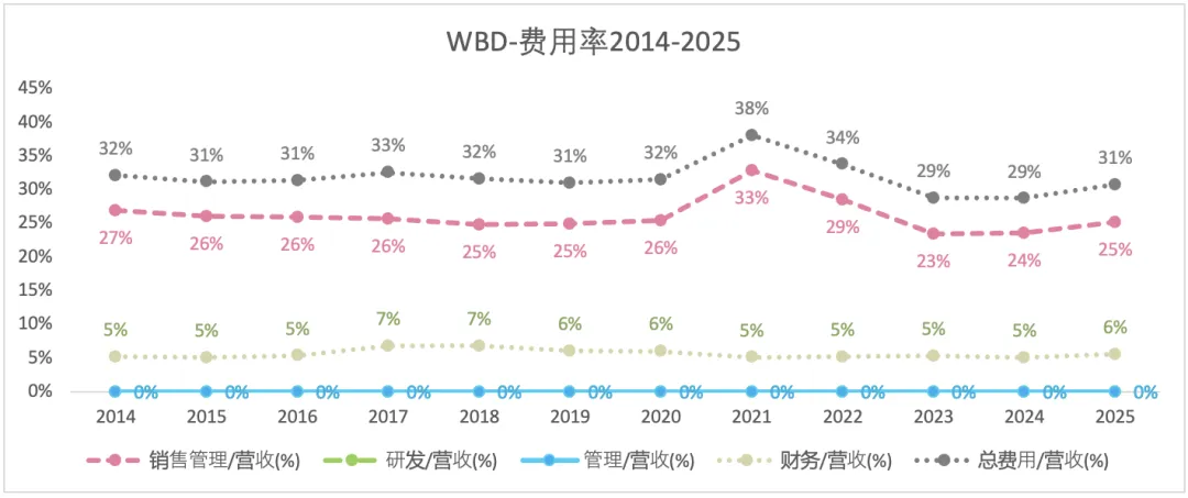 从费用率细分来看,WBD没有研发费用,销售费用和管理费用是合在一起披露的。2025年,WBD销售管理费用占比为31%,而奈飞为23%;WBD的财务费用占比(6%)也高于奈飞(2%)。