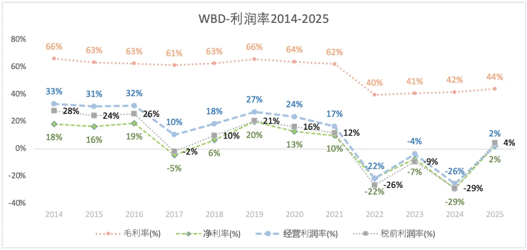 2014-2021年,Discovery原有业务的毛利率还是蛮高的,始终稳定在62%-66%;2022年Discovery和华纳合并之后,毛利率下降到40%,之后略有提升至2025年的44%。