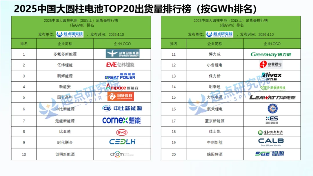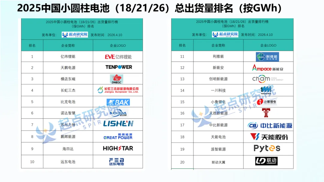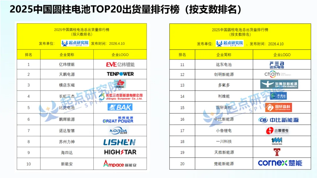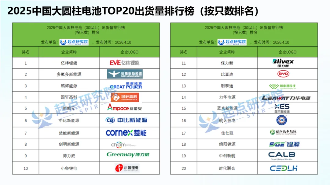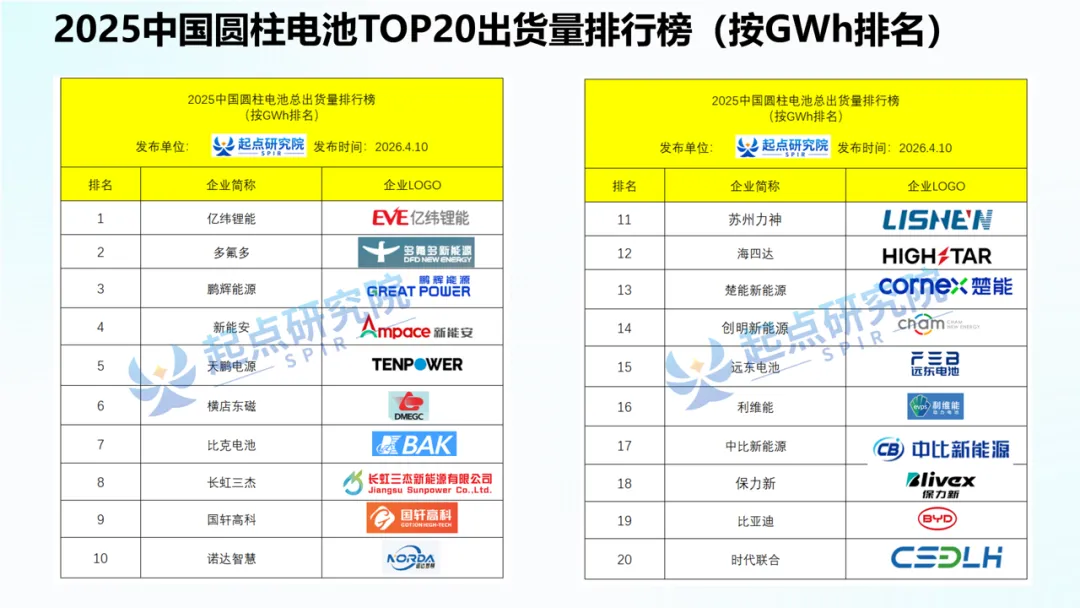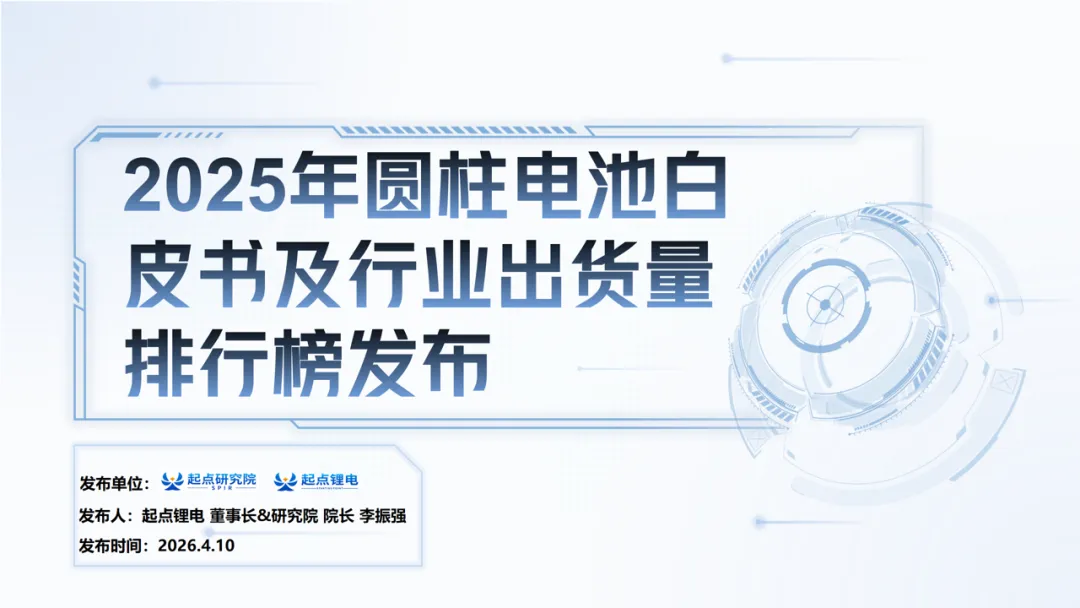 2026年4月10日,2026(第二届)起点圆柱电池技术论坛暨圆柱电池20强排行榜发布会在深圳正式举办,同期起点研究院SPIR联合起点锂电重磅发布《2026中国圆柱电池行业白皮书报告》,以下为具体内容: