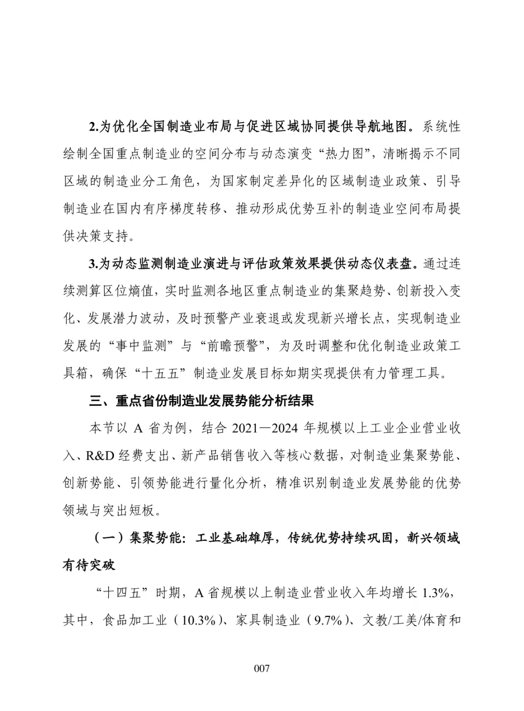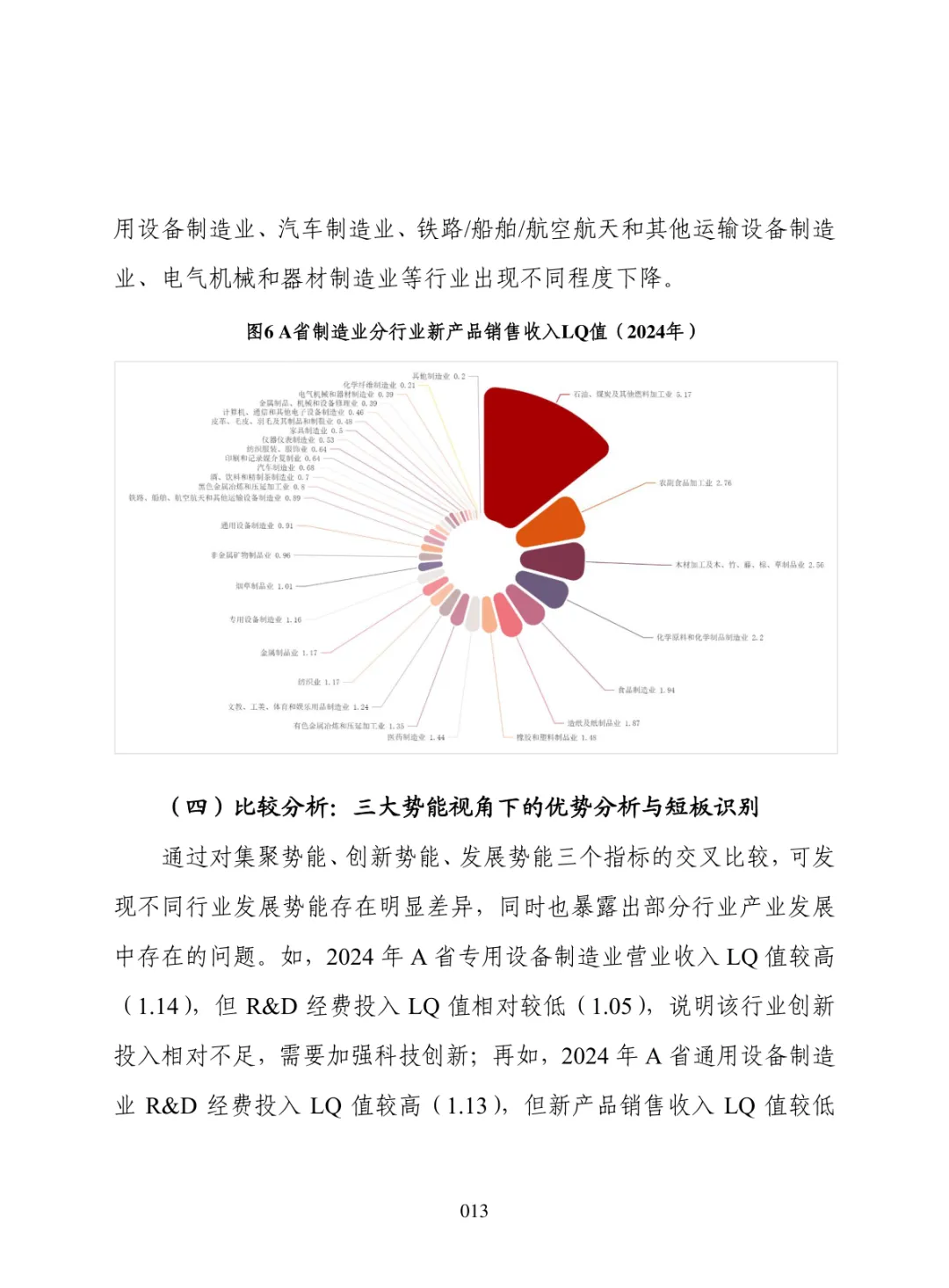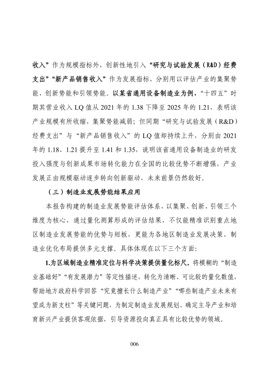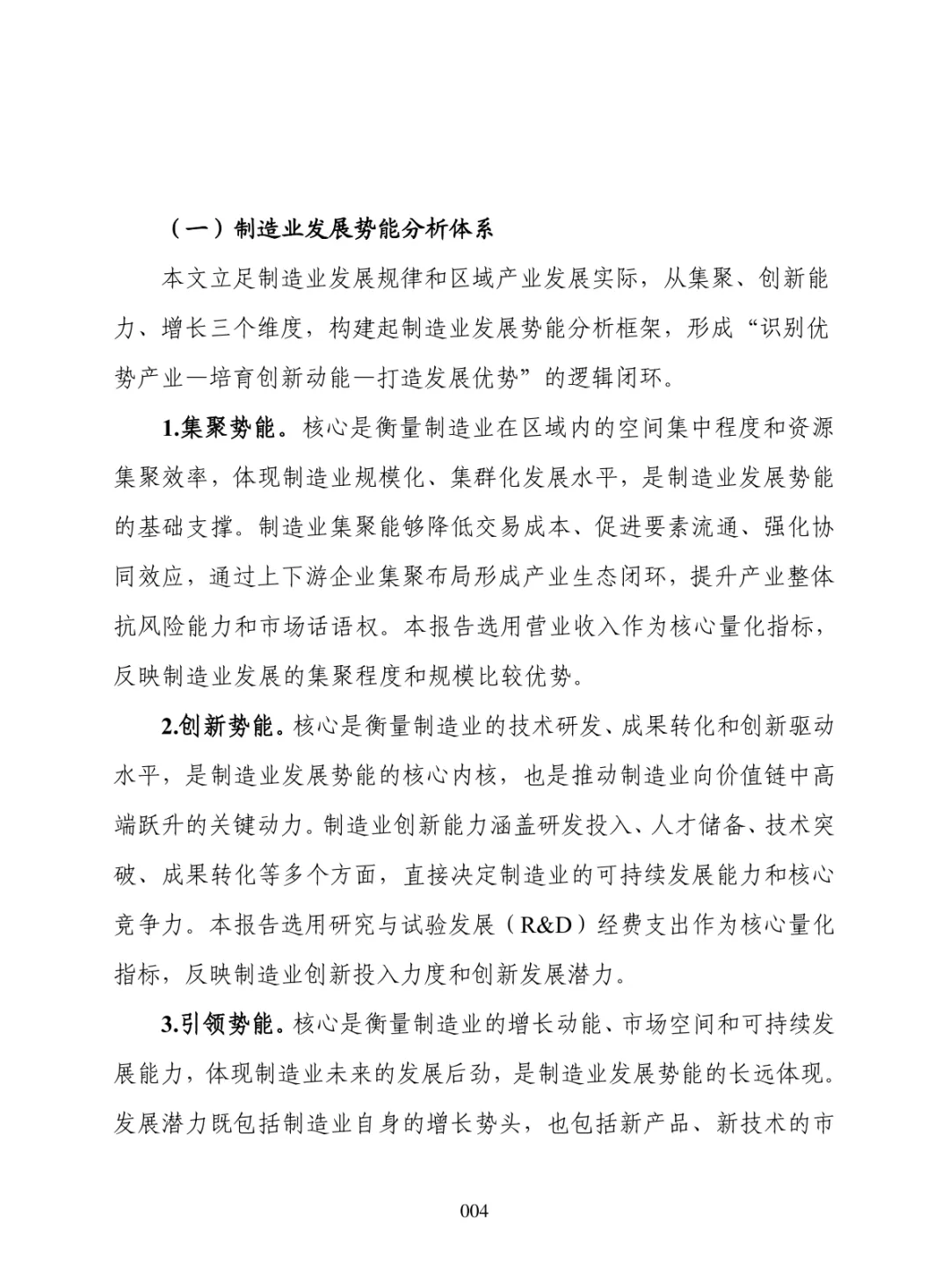 导读:报告聚焦 “十五五” 制造业高质量发展需求,构建集聚势能、创新势能、引领势能三维评价体系,运用区位熵方法开展量化分析。提升制造业发展势能是推动区域经济跃升、拓展增长空间、构建现代化产业体系的重要路径。集聚势能以营业收入为核心指标,反映产业规模与集群化水平。创新势能以研发经费支出为核心指标,体现技术投入与核心竞争力。引领势能以新产品销售收入为核心指标,衡量成果转化与增长潜力。报告以典型省份为样本开展实证分析,该省份轻工、石化、食品加工等行业集聚优势明显,装备制造领域创新投入稳步提升,石化、农副食品加工行业新产品转化表现突出。部分高端装备行业存在规模优势弱化、创新投入不足、成果转化效率偏低等问题。报告提出精准布局赛道、强化创新投入、打通转化堵点、深化链群协同、健全监测机制五大方向,为各地优化制造业布局、培育新动能、提升产业竞争力提供决策支撑。