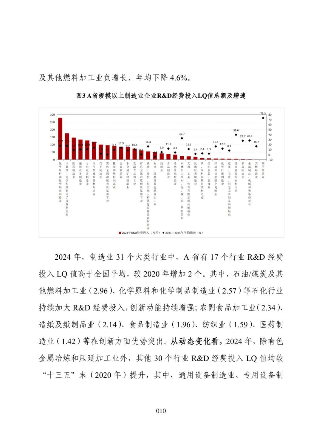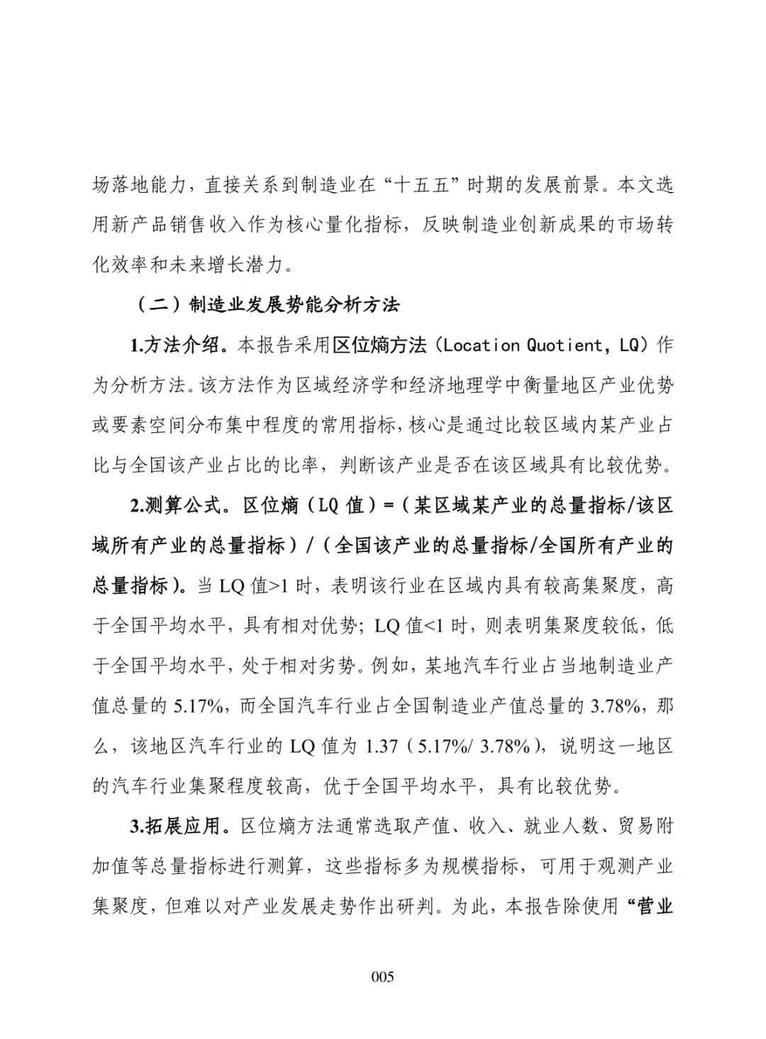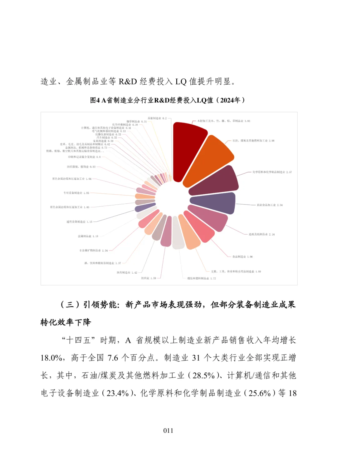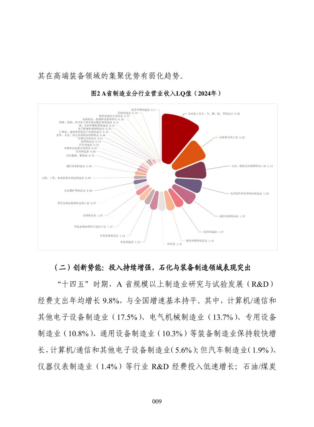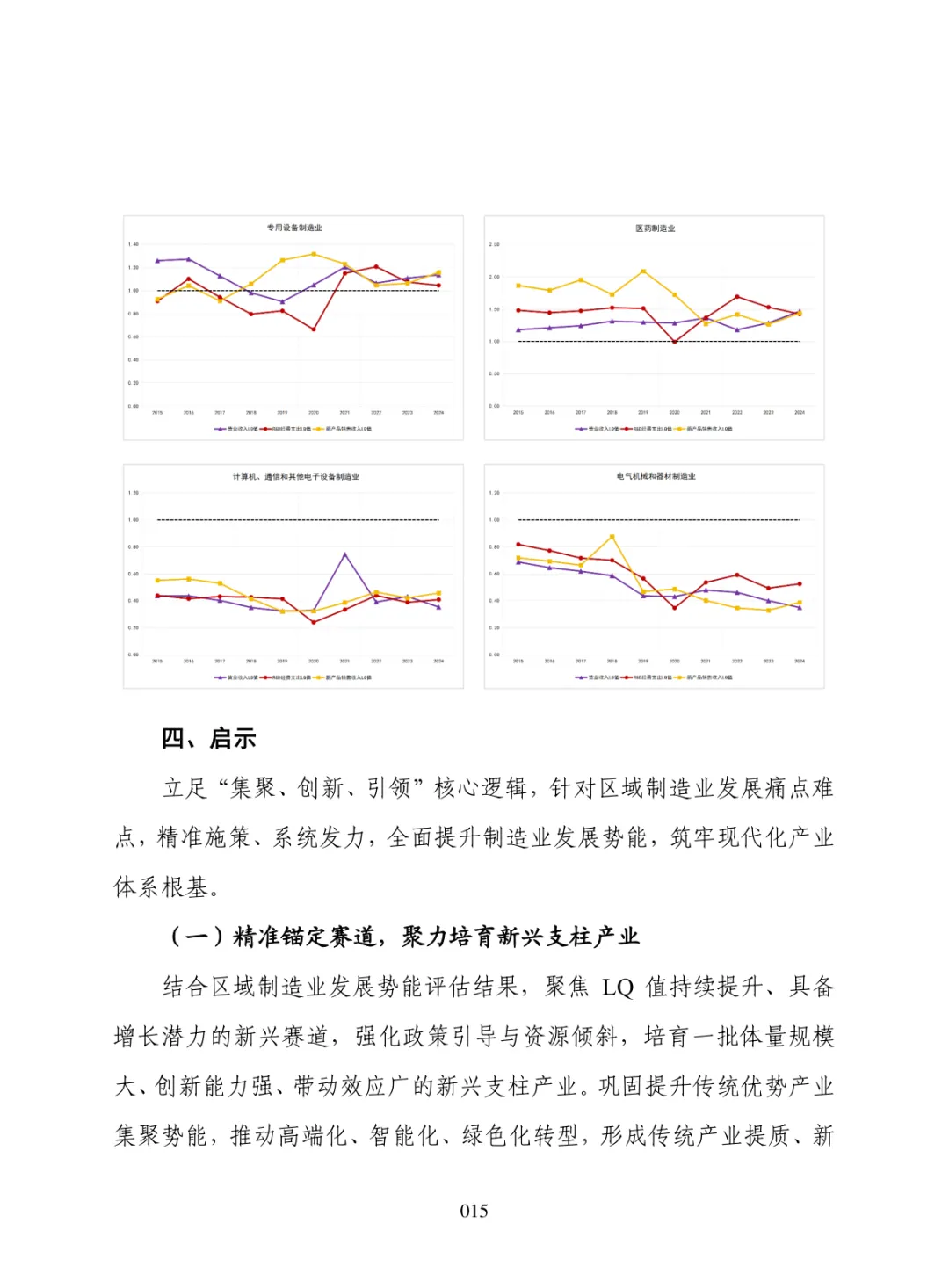 导读:报告聚焦 “十五五” 制造业高质量发展需求,构建集聚势能、创新势能、引领势能三维评价体系,运用区位熵方法开展量化分析。提升制造业发展势能是推动区域经济跃升、拓展增长空间、构建现代化产业体系的重要路径。集聚势能以营业收入为核心指标,反映产业规模与集群化水平。创新势能以研发经费支出为核心指标,体现技术投入与核心竞争力。引领势能以新产品销售收入为核心指标,衡量成果转化与增长潜力。报告以典型省份为样本开展实证分析,该省份轻工、石化、食品加工等行业集聚优势明显,装备制造领域创新投入稳步提升,石化、农副食品加工行业新产品转化表现突出。部分高端装备行业存在规模优势弱化、创新投入不足、成果转化效率偏低等问题。报告提出精准布局赛道、强化创新投入、打通转化堵点、深化链群协同、健全监测机制五大方向,为各地优化制造业布局、培育新动能、提升产业竞争力提供决策支撑。