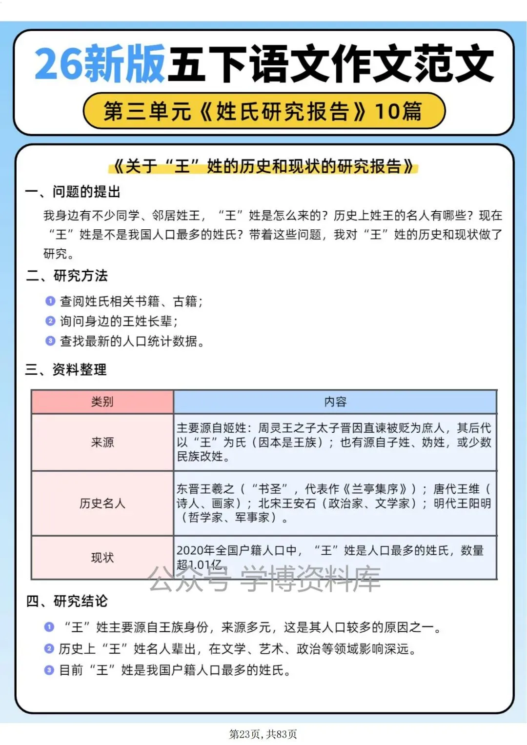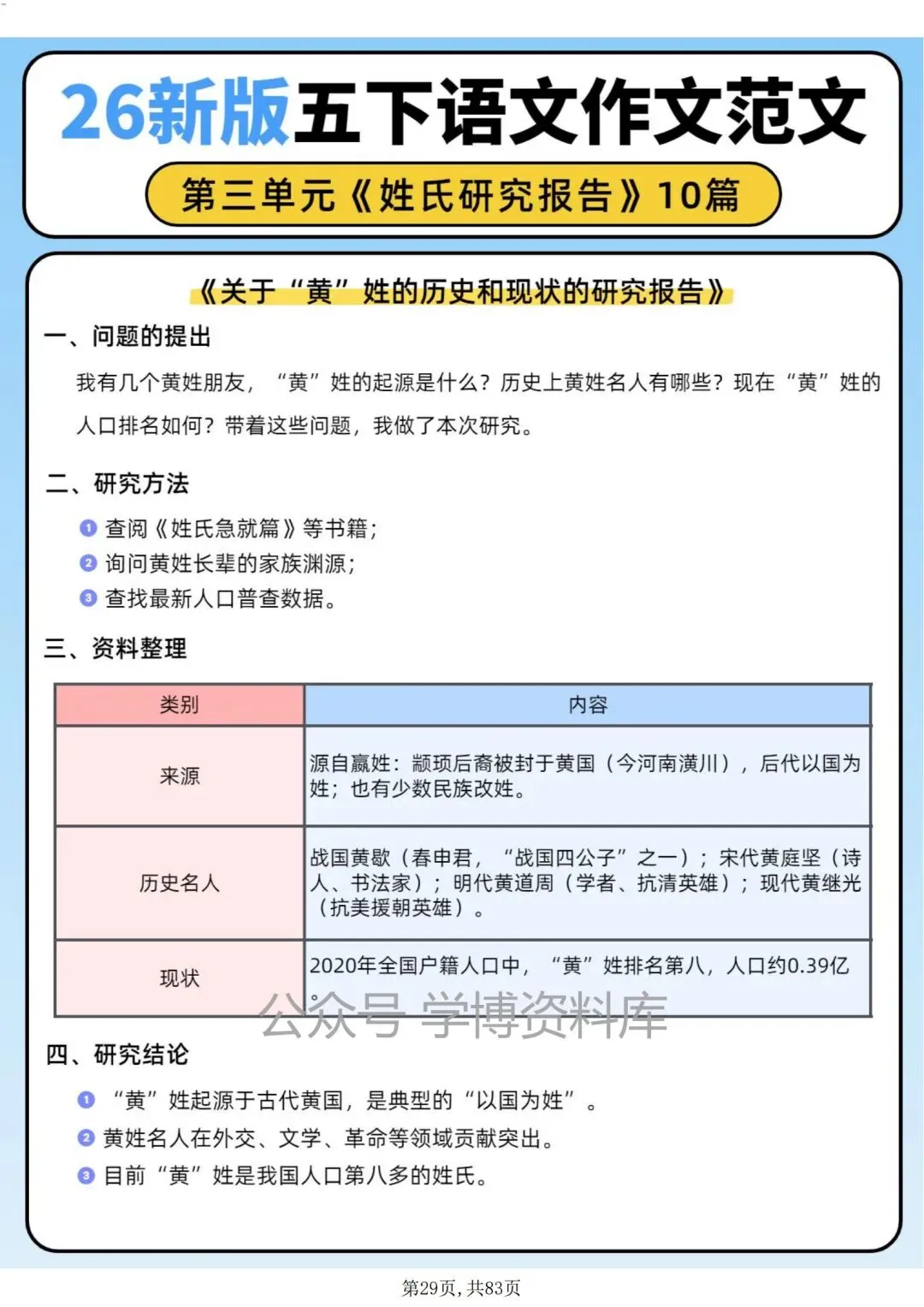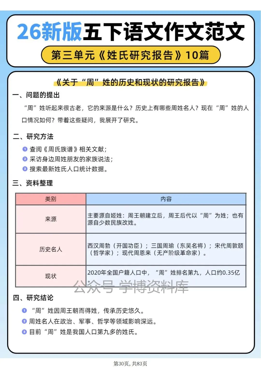 五年级语文下册第三单元作文习作《姓氏研究报告》优秀范文10篇。