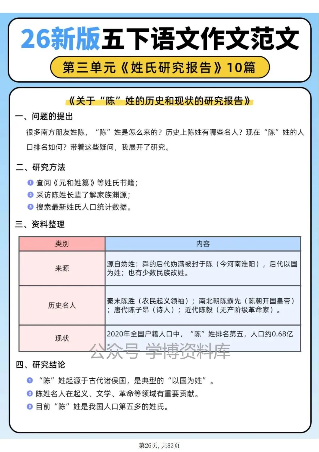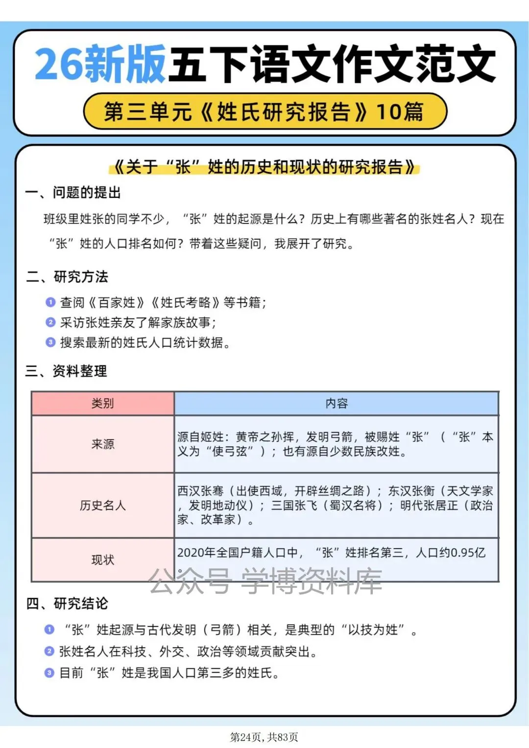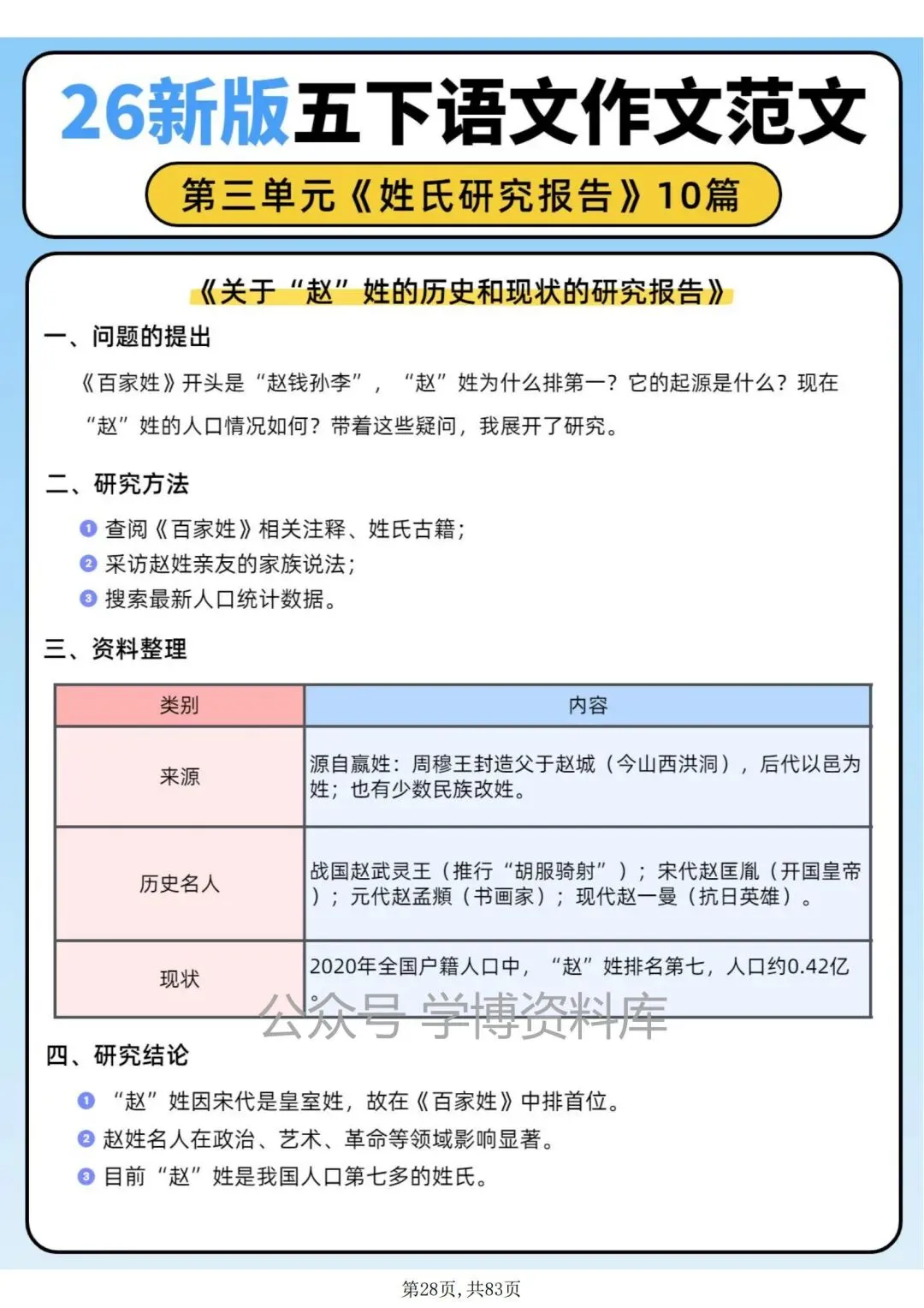 五年级语文下册第三单元作文习作《姓氏研究报告》优秀范文10篇。