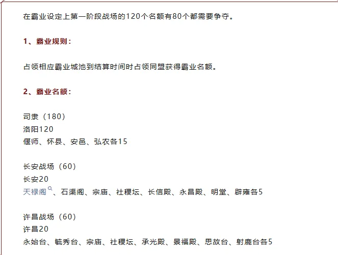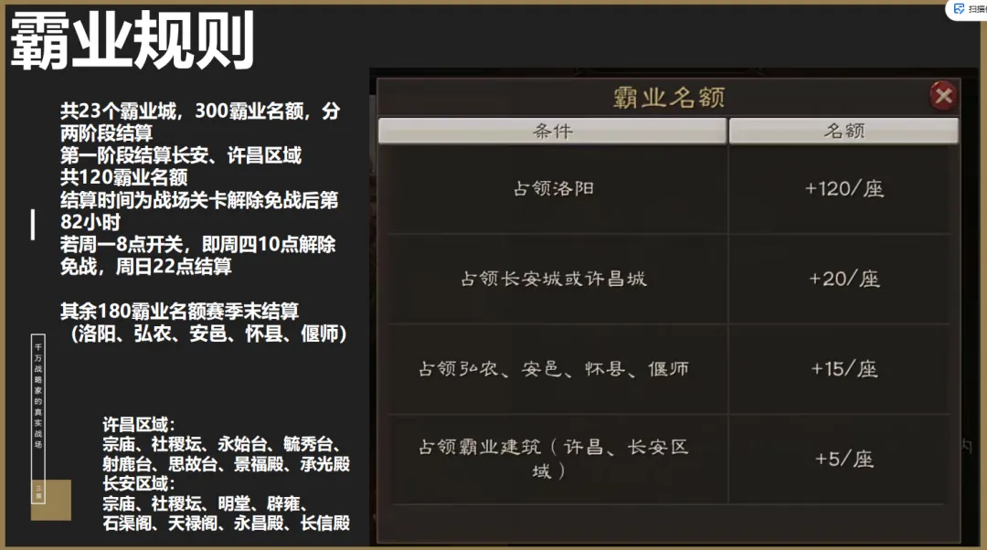 霸业规则还是300霸业,但是别忘记了,每个区还有可以获得霸业名额的雄踞名额,具体规则看另外一篇文章: