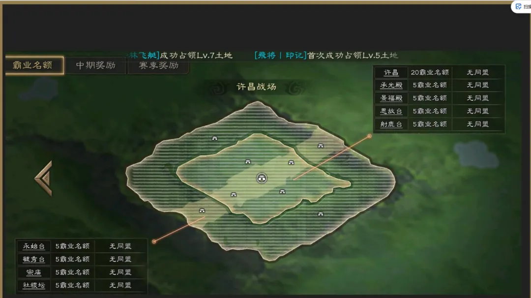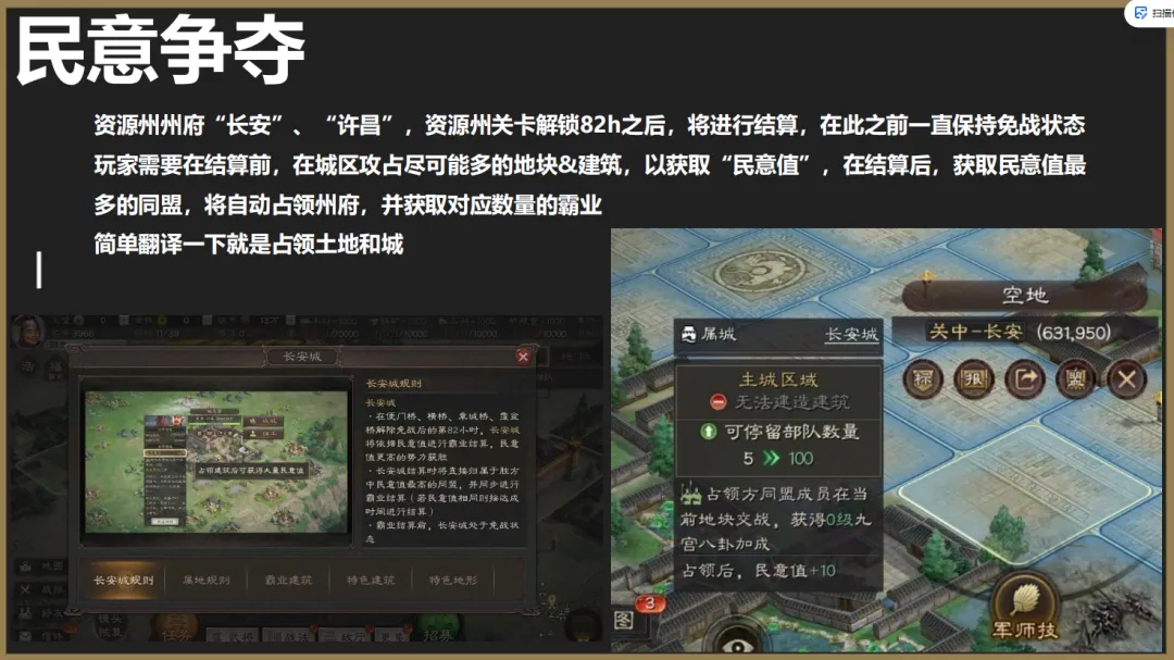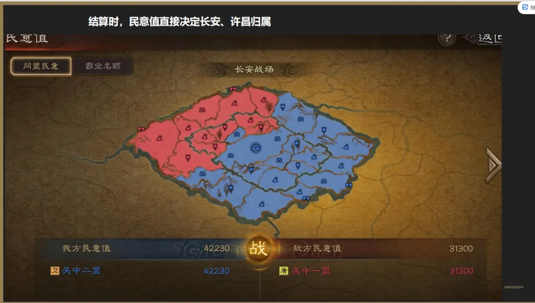 独特的霸业规则,根据土地多少和城池占领多少,导致的民心值不同获得不同的霸业名额!