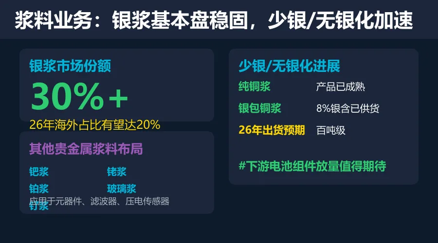 公司银浆市场份额持续稳定在30%+,龙头地位稳固。2026年海外占比有望达到20%,进一步增厚利润。