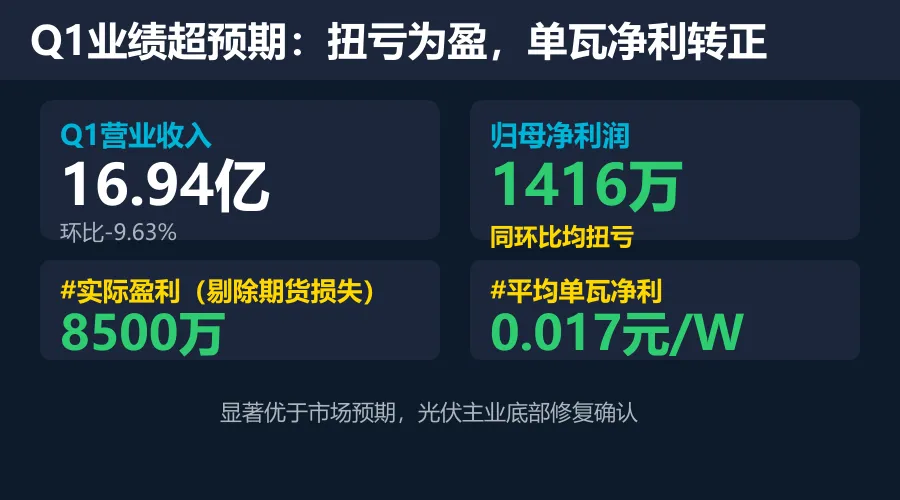 Q1实际盈利8500万元,单瓦净利0.017元/W,显著优于市场预期,盈利能力实质性改善。