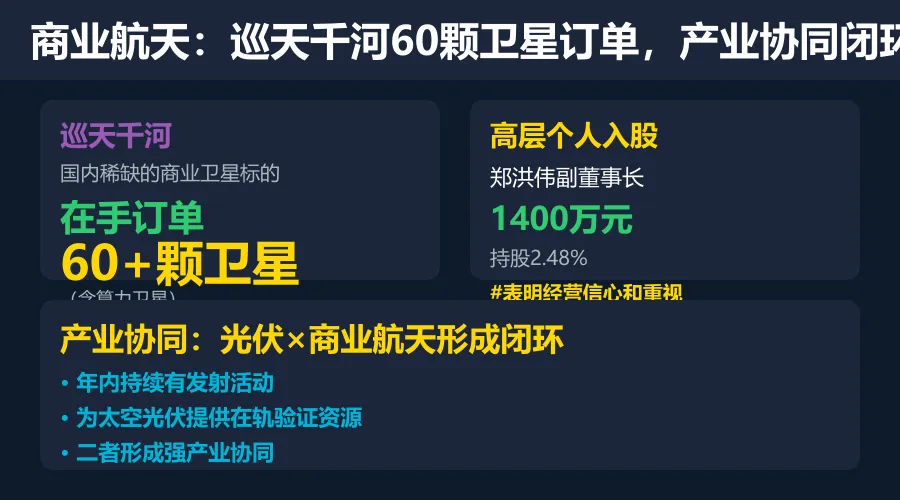 巡天千河60颗卫星在手订单,高层1400万元个人入股彰显信心,光伏×航天产业协同闭环。