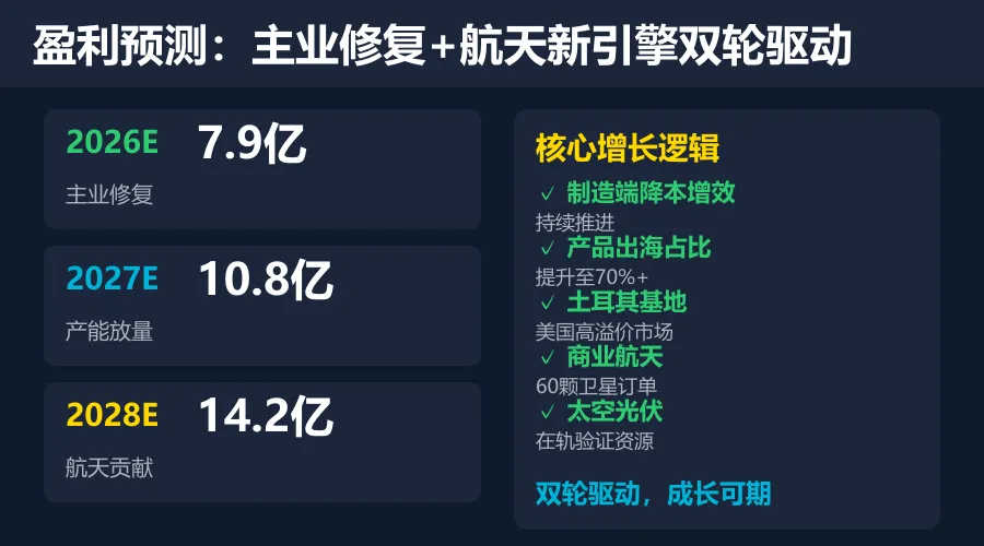 光伏主业修复+商业航天新引擎,预计2026-2028年归母净利润7.9/10.8/14.2亿元,成长确定性高。