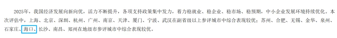 活动当天,中国中小企业发展促进中心同步发布《2025年度中小企业发展环境评估报告》,海口在地级市参评城市中综合表现居第七位,延续了近年稳步提升的良好态势。报告特别关注到我市在破除准入壁垒、提升政务服务效能方面的进展;创新上线的“公平竞争审查智慧化监测评估系统”获得积极评价,该系统运用大数据与人工智能手段识别排除限制竞争条款,有效维护了市场公平秩序。