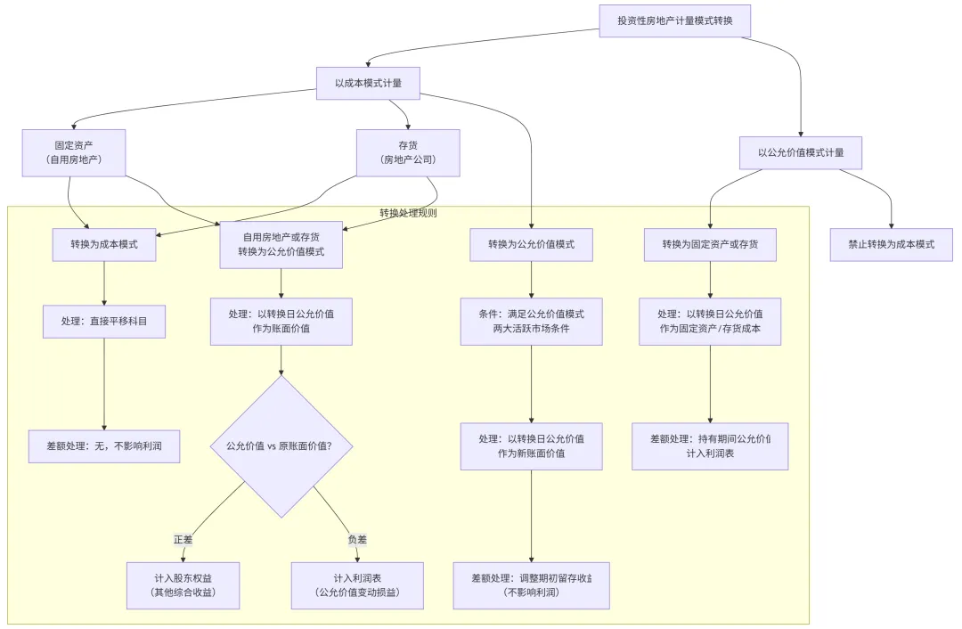 公允价值模式 → 固定资产/存货(特指房地产公司):转换日公允价值作为新成本,持有期间已确认的公允价值变动需在转换时计入当期利润表。