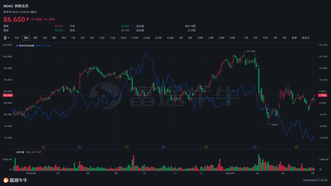 (恒生科技10月初到顶后几乎单边下跌,纳斯达克则震荡2个月后在12月持续走高)