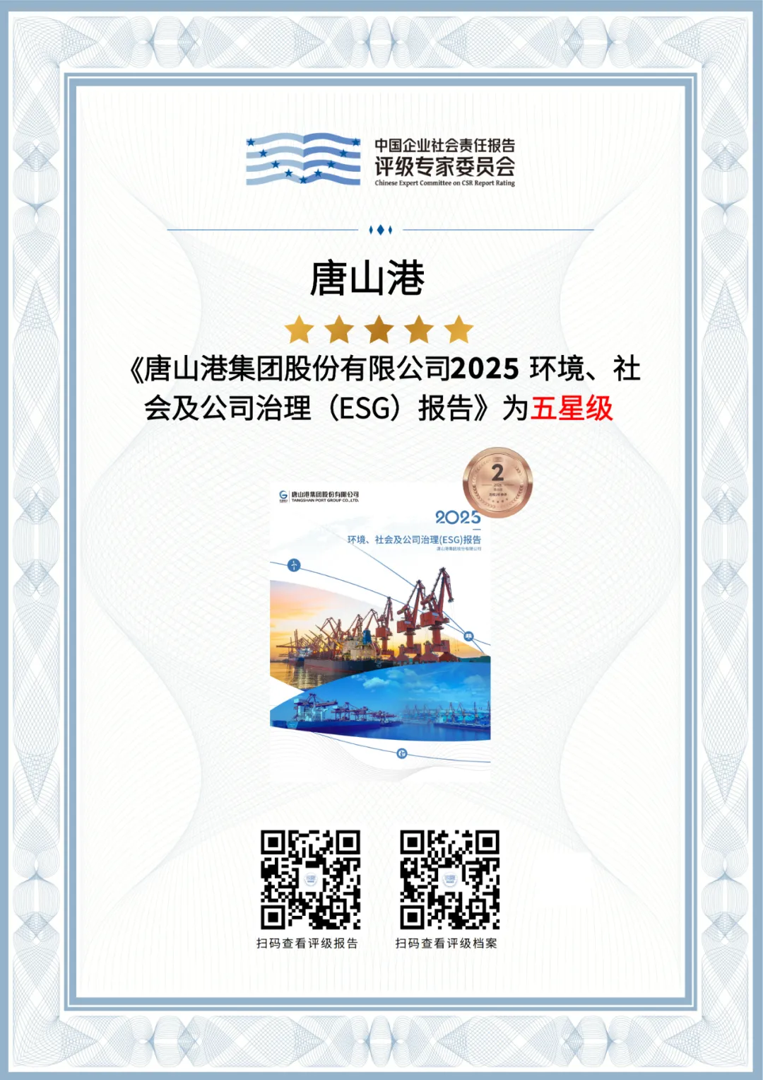 经“中国企业社会责任报告评级专家委员会”评定,《唐山港集团股份有限公司2025环境、社会及公司治理(ESG)报告》为“五星级”,是一份卓越的企业可持续发展报告。
