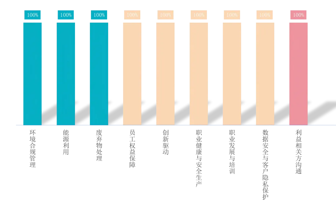 《报告》系统披露了装卸搬运和仓储业核心指标的88.65%,其中环境维度下环境合规管理、能源利用、废弃物处理,社会维度下员工权益保障、创新驱动、职业健康与安全生产、职业发展与培训、数据安全与客户隐私保护,治理维度下利益相关方沟通等议题的核心指标覆盖率最高,均达100%。