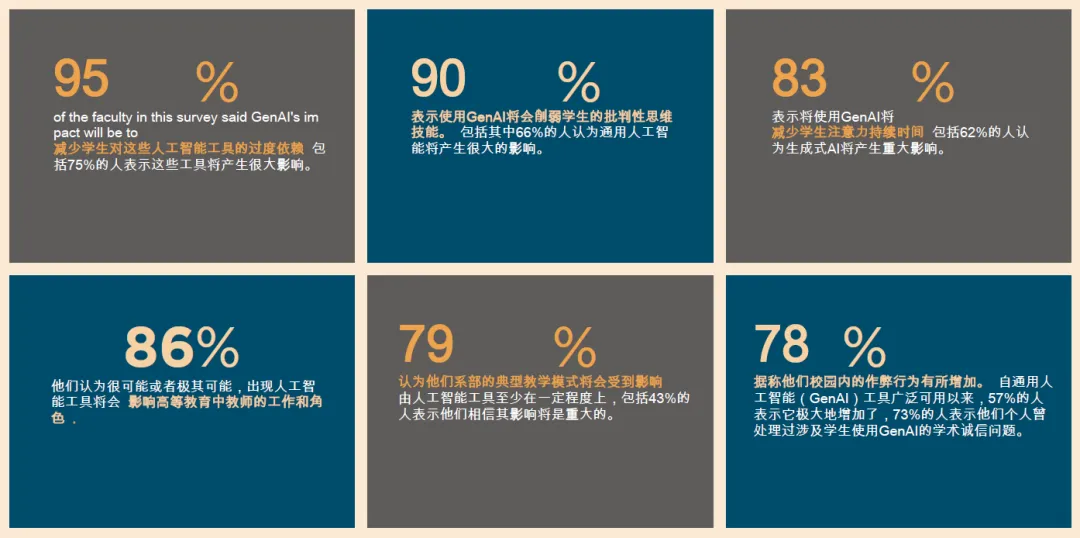 二是学生核心能力培养的缺失。90% 的美国高校教师担忧,生成式 AI 会削弱学生的批判性思维能力,83% 的教师认为 AI 会缩短学生的注意力时长,95% 的教师强烈担忧学生对 AI 形成过度依赖。教育的核心价值,在于引导学生完成问题拆解、逻辑推理、试错纠错、反思总结的完整学习过程,而学生直接使用 AI 生成作业、论文与答案,跳过了这一核心训练环节,最终导致独立思考能力、逻辑推理能力、基础写作能力的全面退化。