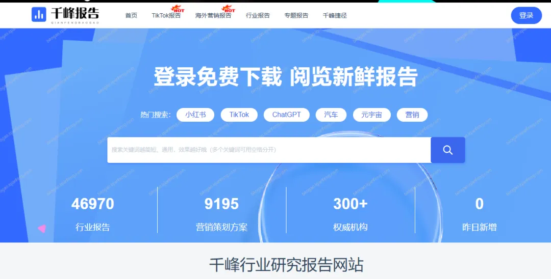 千峰报告网,作为一个全行业研究报告与营销策划方案免费下载网站,汇集了2025新鲜的汽车、电商、餐饮,互联网等数十个行业,近10万+行业报告及方案文件,支持在线预览并免费下载,更多行业研报尽在千峰报告网。