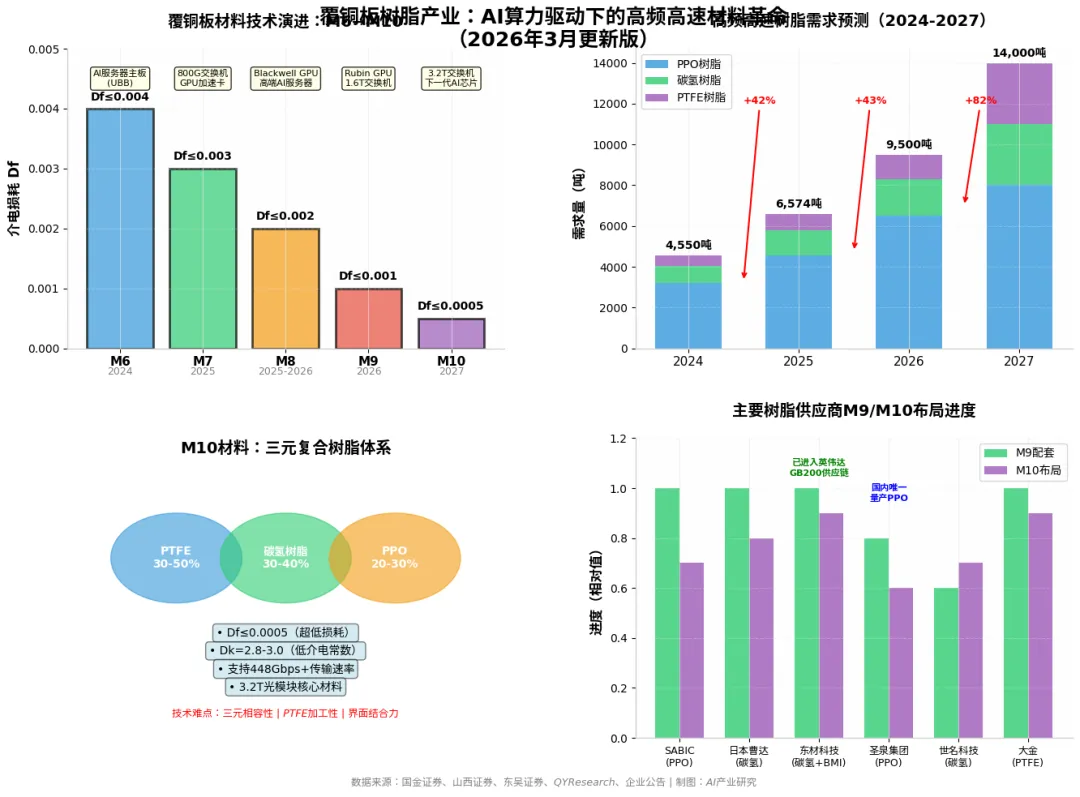 4)东材科技(碳氢树脂+BMI双龙头,3500吨M9/M10级产能2026年投产,已进入英伟达供应链)、圣泉集团(PPO龙头,全系列布局,M10低分子量PPO开发中)等国内企业凭借在M8/M9的技术积累和产能扩张,有望在M10时代实现从"国产替代"到"全球供应"的跨越,深度受益于AI算力建设带来的材料升级浪潮。