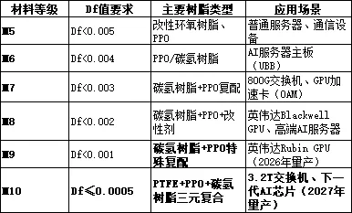 AI服务器、数据中心建设对高频高速覆铜板提出严苛要求,推动树脂材料从传统环氧树脂向低介电(Low Dk)、低损耗(Low Df)方向升级: