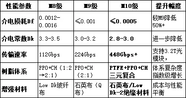 M10级覆铜板是目前业界公开的最高等级覆铜板材料,其介电性能较M9实现数量级突破: