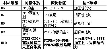 2)三元体系相容性:PPO(极性)、碳氢树脂(非极性)、PTFE(强非极性)相容性差,需特种相容剂;