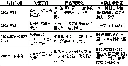 关键变化:相比M9材料测试仅有台光电一家最先通过认证,M10阶段英伟达将测试范围扩展至三家供应商,新增两家中国厂商,多元化采购策略有望改善议价能力和供应链韧性。