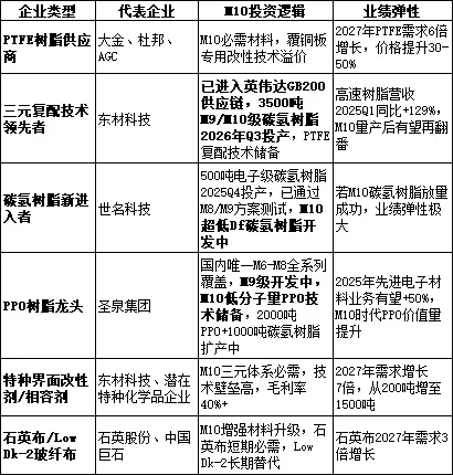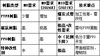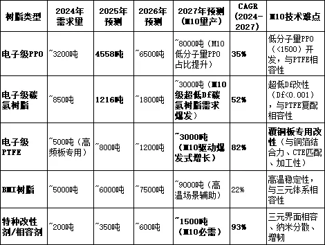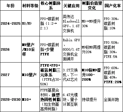 4)树脂价值量跃升:M10覆铜板树脂成本占比从M9的25-30%提升至35-40%,单平方米覆铜板树脂价值量较M9提升2-3倍。