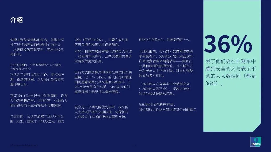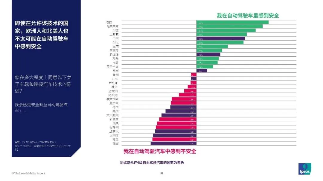 全球 36% 认为乘坐自动驾驶汽车安全,36% 认为不安全,态度完全对立。
