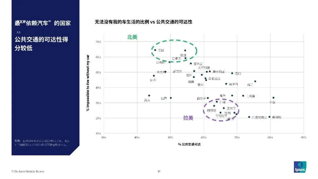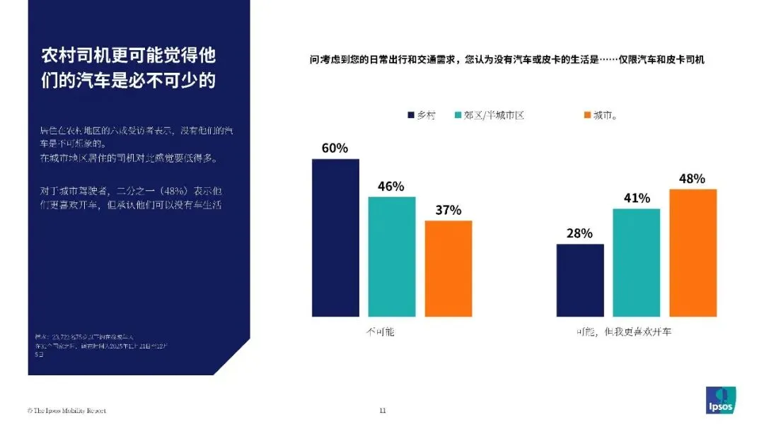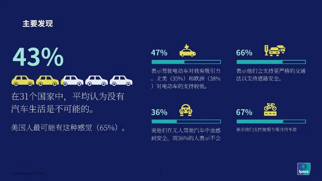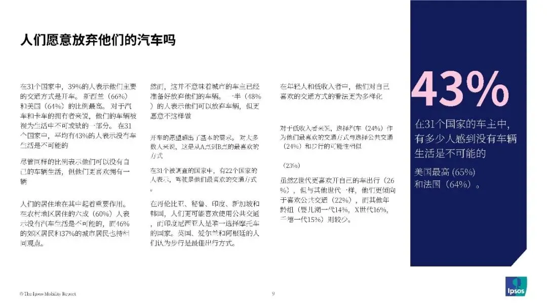全球43% 车主认为没有汽车无法生活,美国(65%)、法国(64%)比例最高;农村居民(60%)依赖度远高于郊区(46%)、城市(37%)。