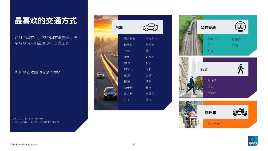 31 个国家中22 国将驾车列为最喜爱出行方式;哥伦比亚、秘鲁、印度等国偏好公共交通,英国、爱尔兰等偏好步行,仅印尼首选摩托车。