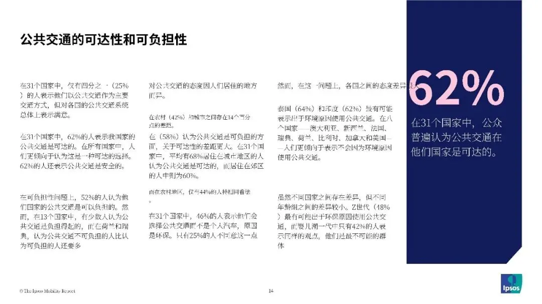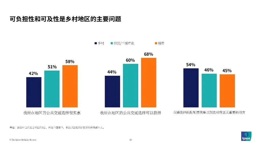 全球62%认为公共交通可达、安全,52%认为可负担;但农村可达性(44%)、可负担性(42%)远低于城市,城乡差距明显。
