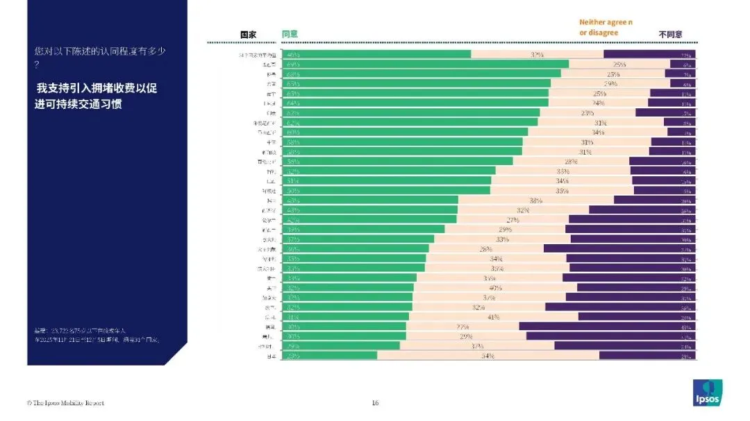 全球 46%支持拥堵收费,城市与年轻群体支持率超 50%;墨西哥、秘鲁、泰国等国支持率显著高于欧美。