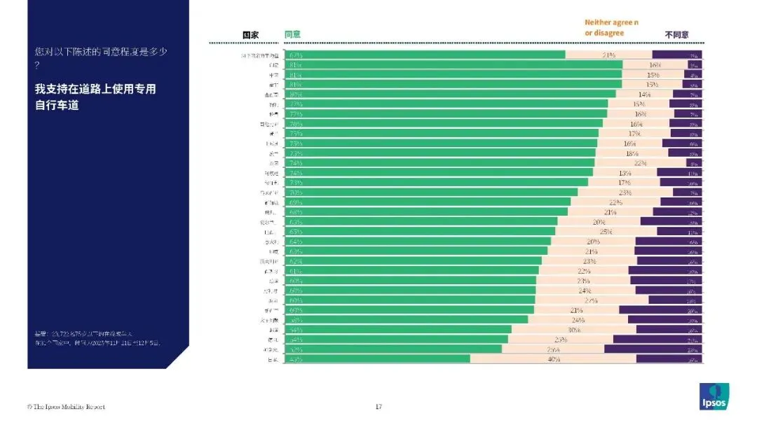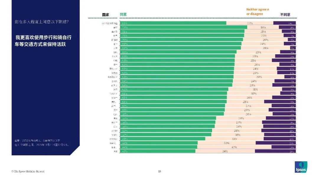 67%支持专用自行车道,61% 愿通过步行、骑行等主动出行保持健康,城市居民支持度更高。