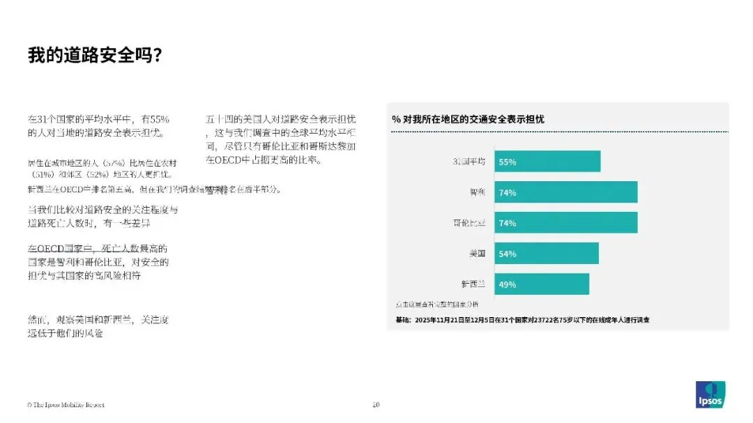 全球 55%受访者担忧当地道路安全,城市居民(57%)担忧度高于农村、郊区;智利、哥伦比亚担忧度最高,美国与实际风险不匹配。