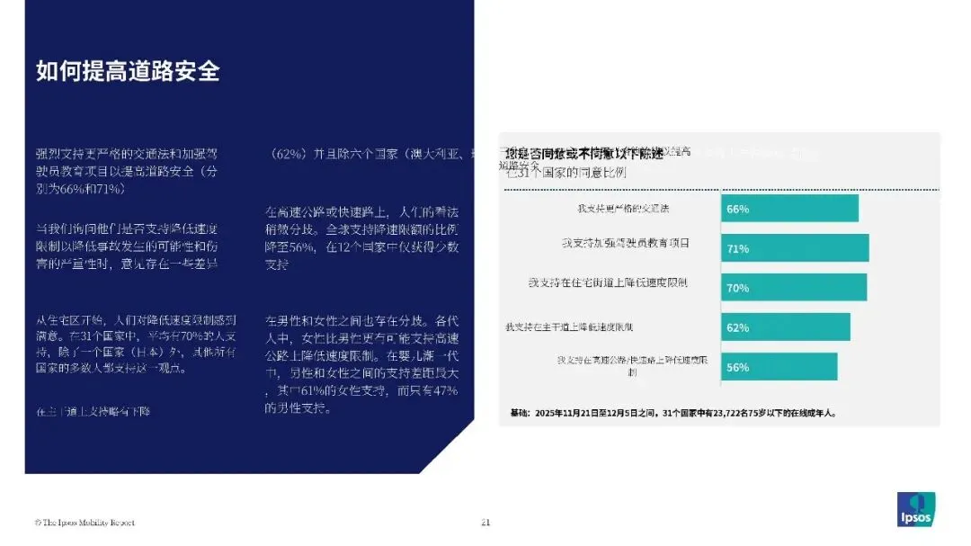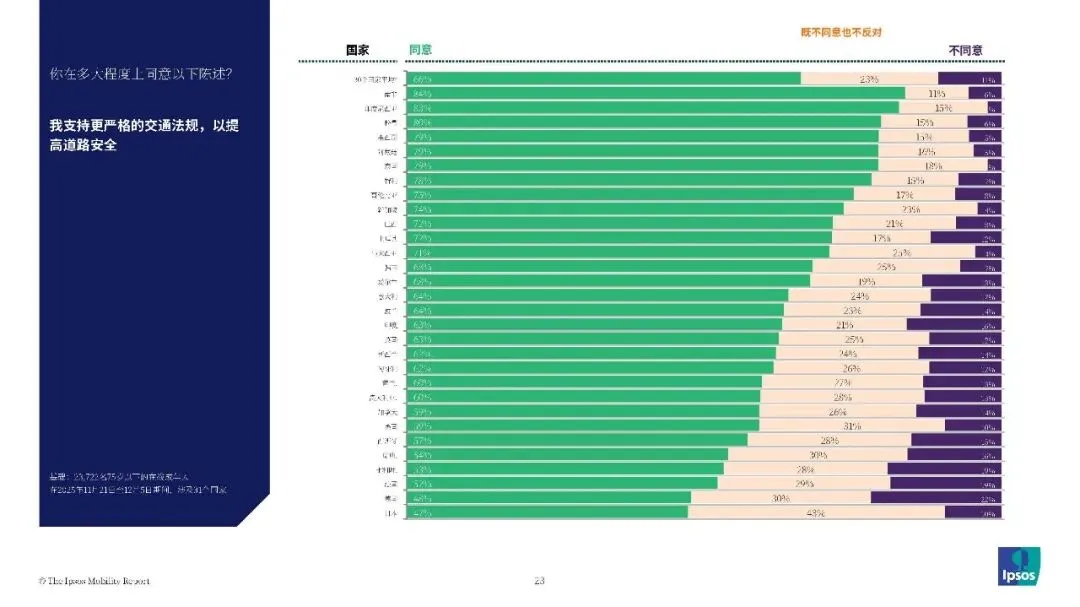 71% 支持加强驾驶员教育,66% 支持更严格交通法规,南非、印尼、秘鲁等国支持率超 80%。