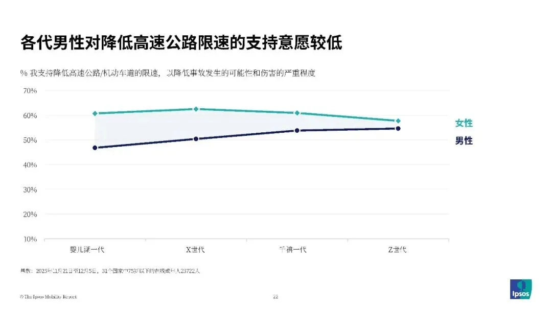 降速措施支持度:住宅街道70%、主干道62%、高速公路56%;女性、年轻群体更支持高速公路降速,婴儿潮一代性别差异最大。