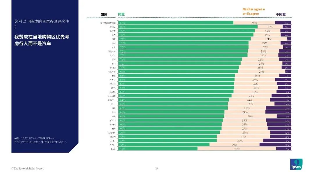 67% 支持在购物区优先行人而非汽车,阿根廷、墨西哥、秘鲁支持率超 75%。