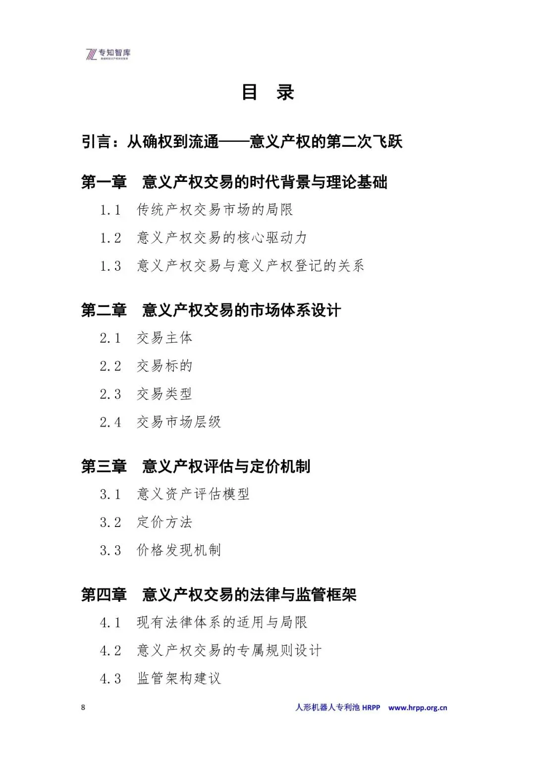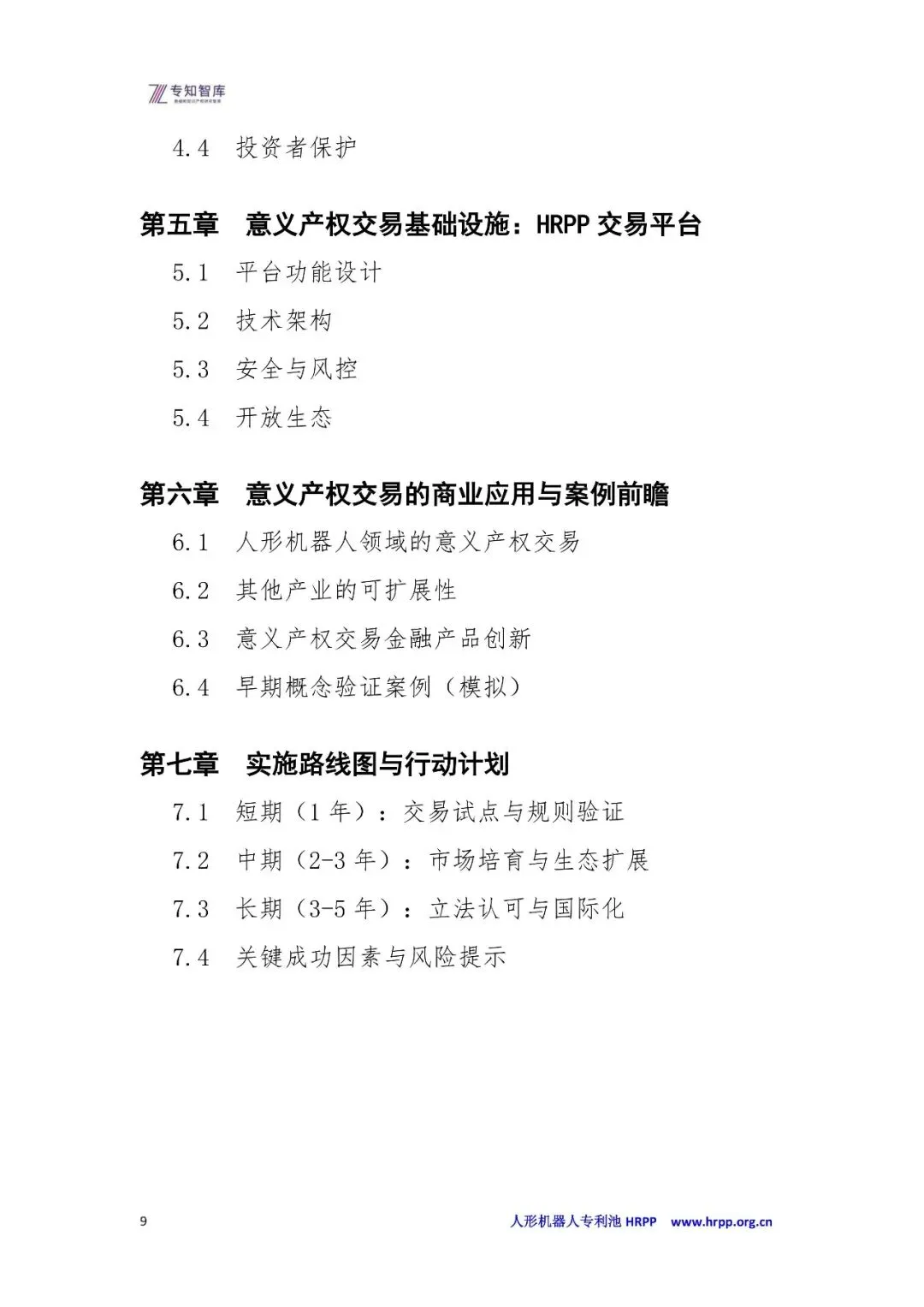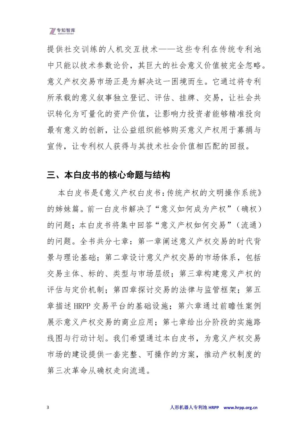 1.1.3 人形机器人专利池的典型困境。人形机器人领域是上述问题的集中体现。HRPP平台在前期调研中发现,超过80%的专利权人认为,其专利除了技术价值外,还承载着“帮助残障人士”“守护老年人安全”“推动教育公平”等社会意义,但传统专利池完全无法体现这些价值。超过70%的潜在被许可人表示,如果一项专利具有清晰的社会意义叙事,他们愿意支付20%-50%的溢价;超过60%的影响力投资机构表示,如果能够量化专利的社会意义,他们会将其作为重要的投资决策因子。然而,由于缺乏意义价值的评估和交易机制,这些潜在需求无法转化为实际交易。意义产权交易市场的建设,正是为了打破这一僵局。