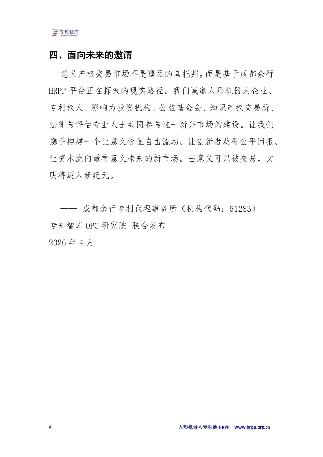 意义产权交易市场不是遥远的乌托邦,而是基于成都余行HRPP平台正在探索的现实路径。我们诚邀人形机器人企业、专利权人、影响力投资机构、公益基金会、知识产权交易所、法律与评估专业人士共同参与这一新兴市场的建设。让我们携手构建一个让意义价值自由流动、让创新者获得公平回报、让资本流向最有意义未来的新市场。当意义可以被交易,文明将迈入新纪元。