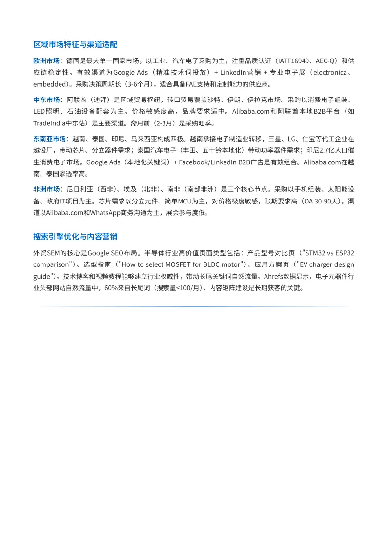 2026年半导体行业呈现内贸与外贸双线并行的营销格局,国内聚焦广东、上海、北京等核心省市,外贸主攻欧洲、中东、东南亚、非洲四大区域,线上渠道成为行业获客核心载体,企业数字化营销能力差异显著。