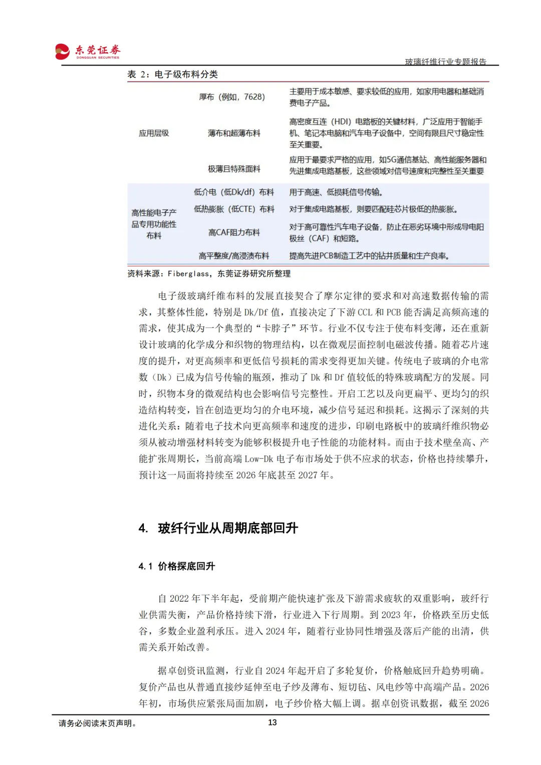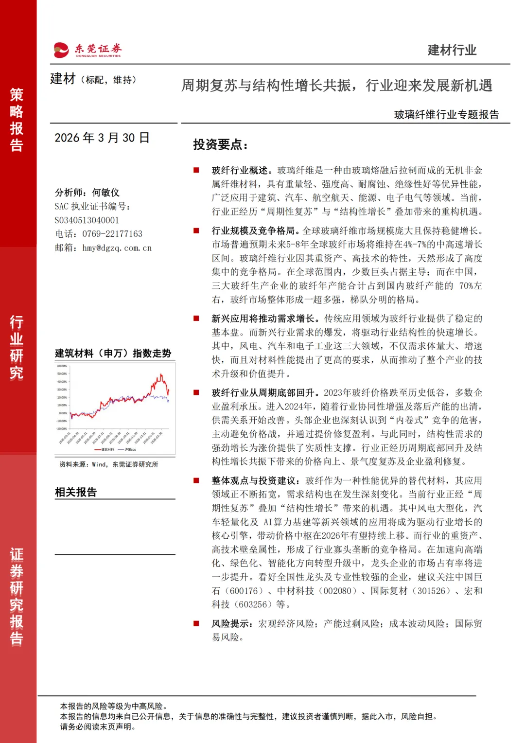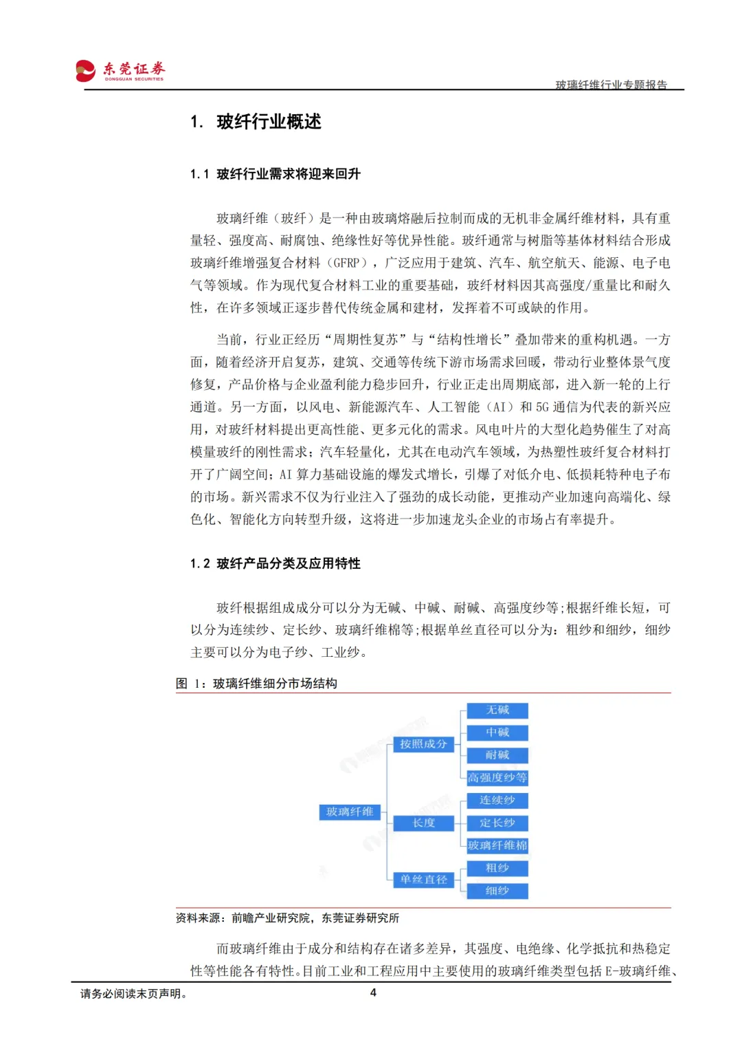 玻纤行业概述。玻璃纤维是一种由玻璃熔融后拉制而成的无机非金属纤维材料,具有重量轻、强度高、耐腐蚀、绝缘性好等优异性能,广泛应用于建筑、汽车、航空航天、能源、电子电气等领域。当前,行业正经历“周期性复苏”与“结构性增长”叠加带来的重构机遇。