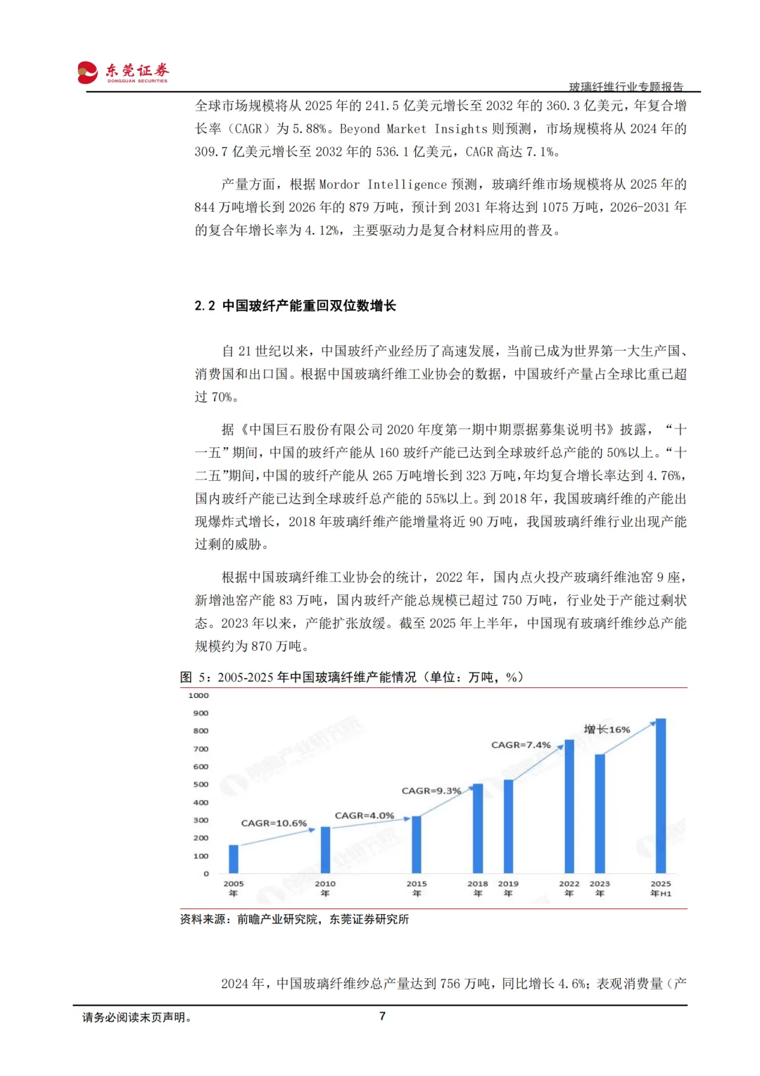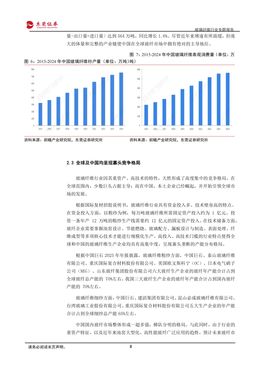 行业规模及竞争格局。全球玻璃纤维市场规模庞大且保持稳健增长。市场普遍预期未来5-8年全球玻纤市场将维持在4%-7%的中高速增长区间。玻璃纤维行业因其重资产、高技术的特性,天然形成了高度集中的竞争格局。在全球范围内,少数巨头占据主导;而在中国,三大玻纤生产企业的玻纤年产能合计占到国内玻纤产能的70%左右,玻纤市场整体形成一超多强,梯队分明的格局。