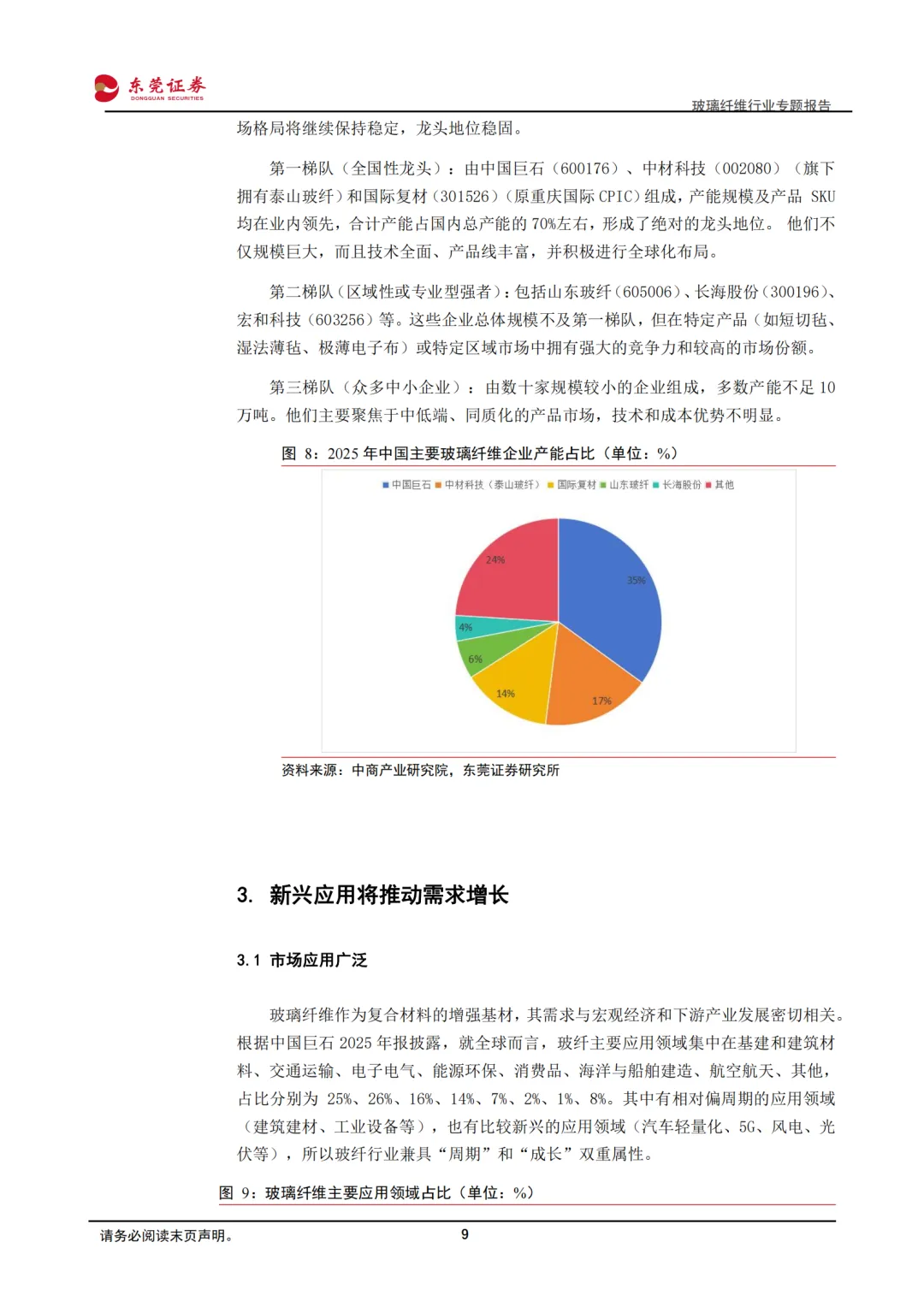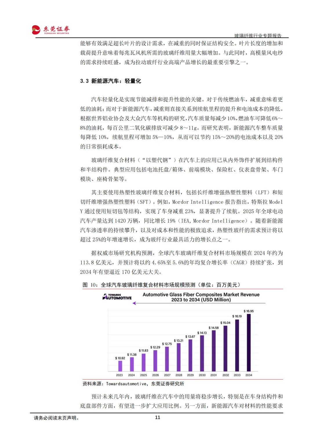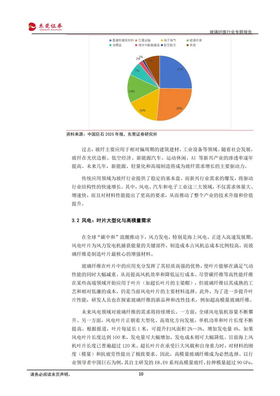 新兴应用将推动需求增长。传统应用领域为玻纤行业提供了稳定的基本盘。而新兴行业需求的爆发,将驱动行业结构性的快速增长。其中,风电、汽车和电子工业这三大领域,不仅需求体量大、增速快,而且对材料性能提出了更高的要求,从而推动了整个产业的技术升级和价值提升。