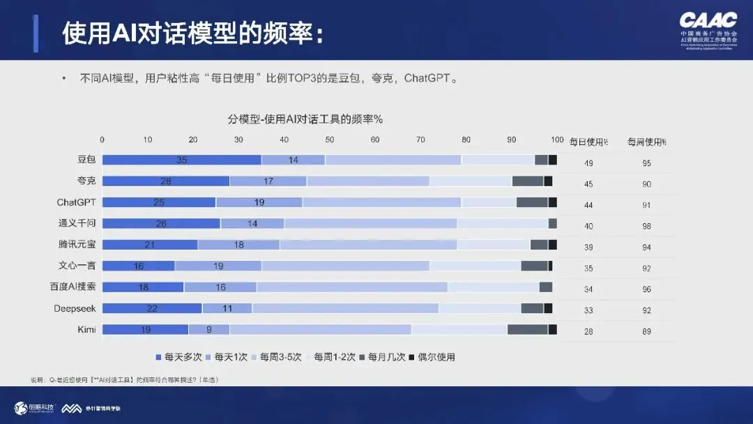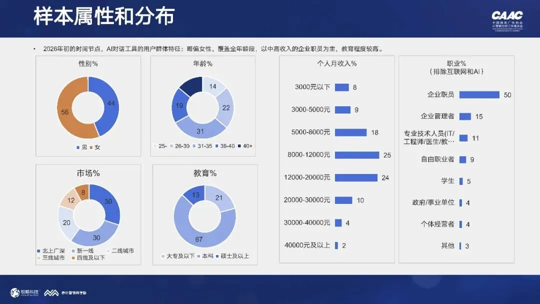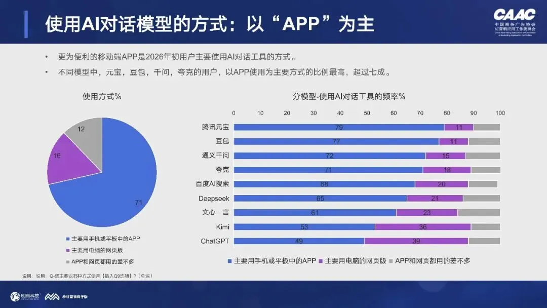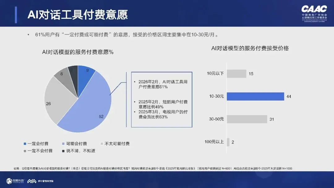 用户对 AI 对话工具的付费意愿也比较高。有 61% 的用户表示一定会或者可能会为 AI 服务付费。他们接受的价格区间主要集中在每月 10 到 30 元之间。这个比例已经接近电视用户的付费会员比例,远高于 2025 年短剧用户的付费意愿。这说明 AI 对话工具已经从免费的尝鲜产品,逐渐变成了用户愿意为之付费的实用工具。