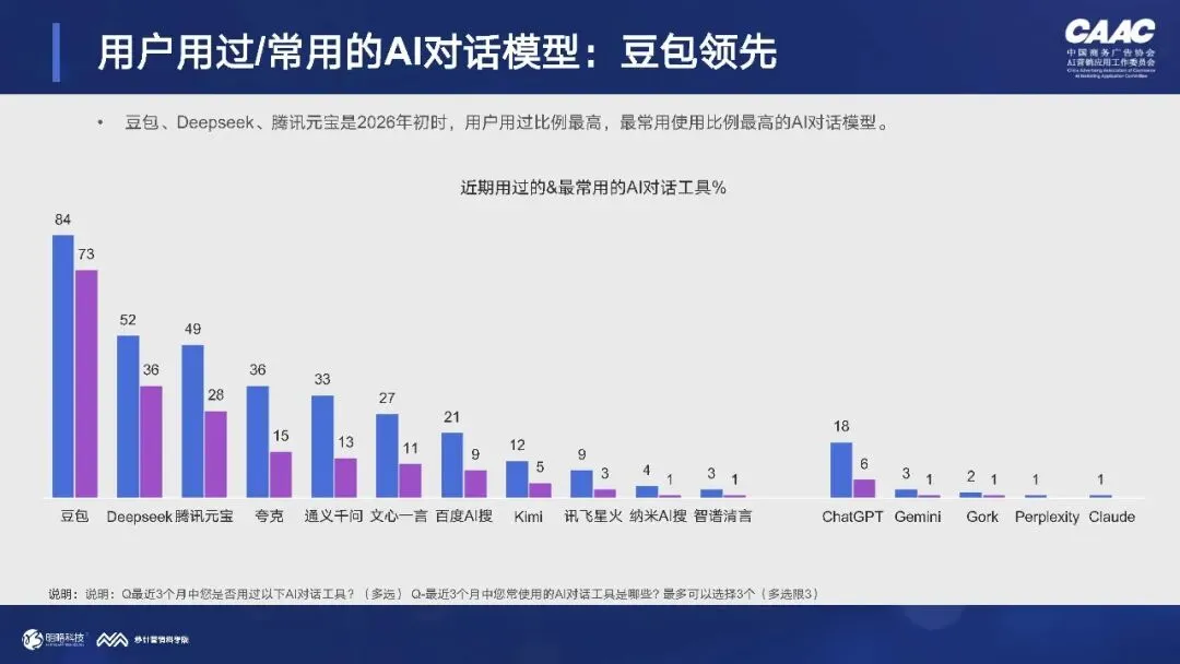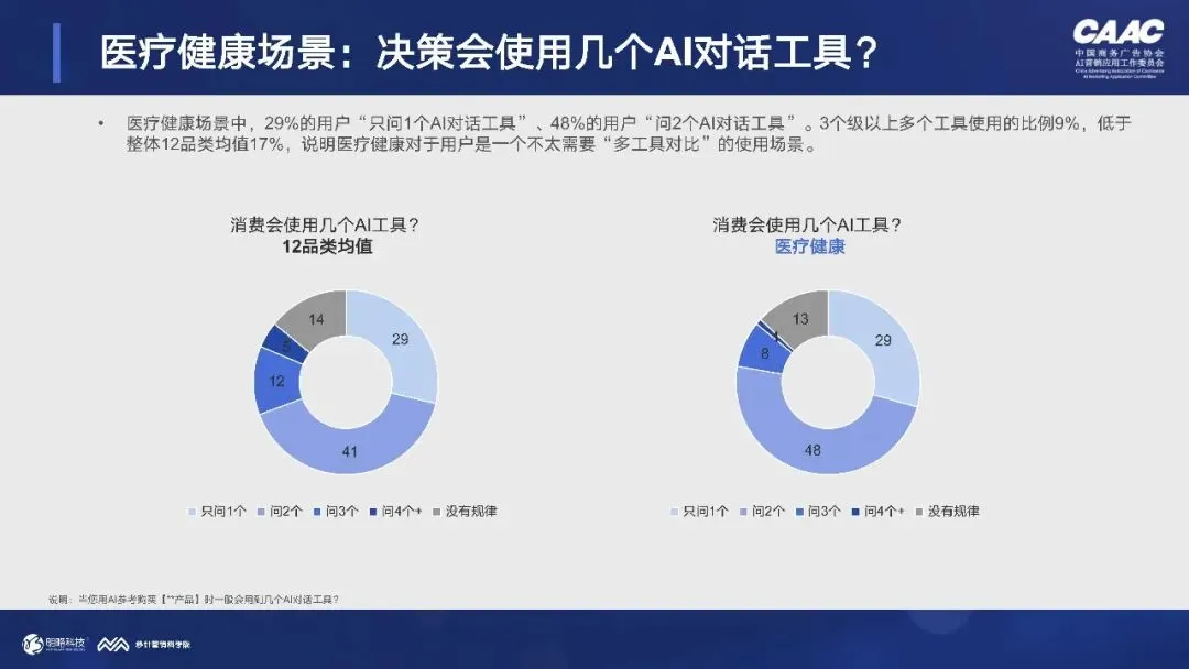 医疗健康领域的用户不太喜欢同时使用多个 AI 工具进行对比。有 29% 的用户只问一个 AI,48% 的用户会问两个。使用三个及以上工具的比例只有 9%,远低于整体 17% 的水平。这可能和医疗健康问题的专业性有关,用户更倾向于相信自己熟悉的那个 AI 给出的答案,而不是在多个不同的回答之间反复权衡。