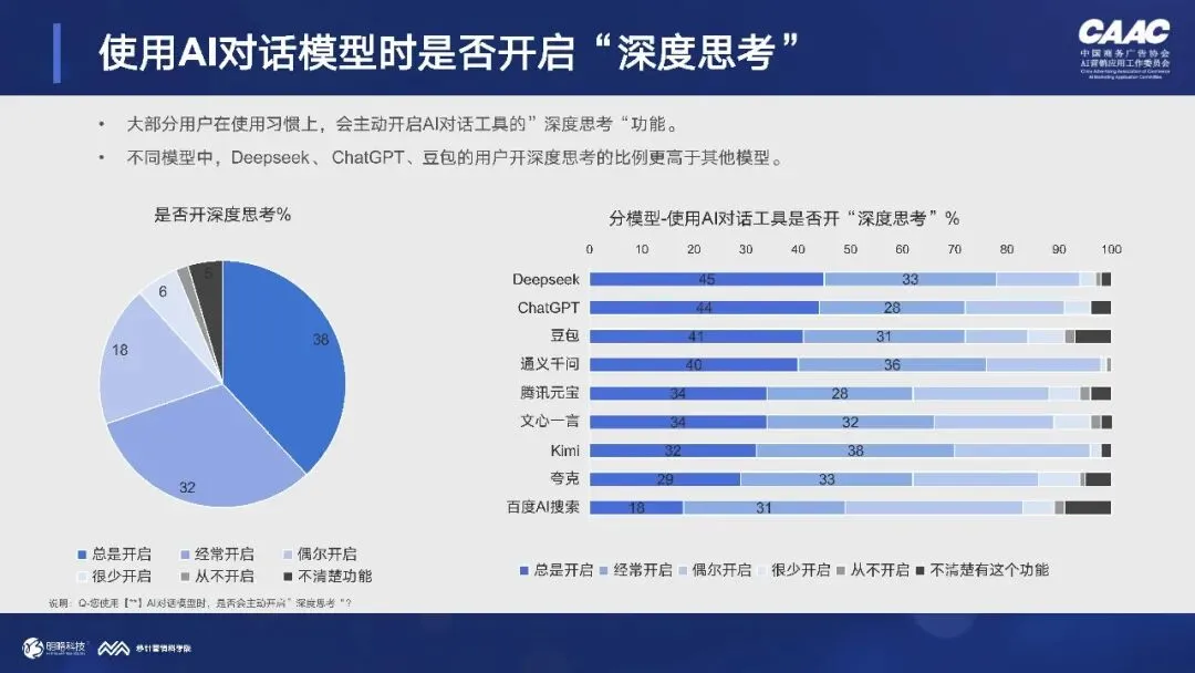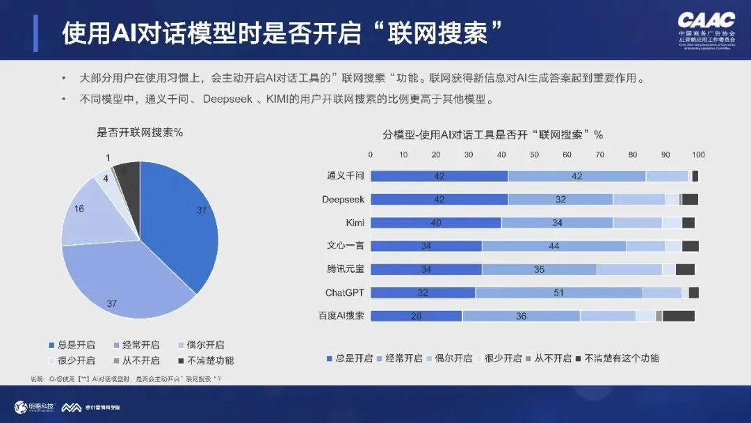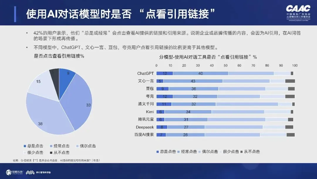 大部分用户主要通过手机 APP 使用 AI 对话工具。有 42% 的用户总是或者经常会点击查看 AI 提供的链接和引用来源。这意味着企业和品牌的内容会因为 AI 的引用而在问答场景中形成二次传播。大部分用户在使用 AI 时会主动开启联网搜索和深度思考功能,以获得更准确和全面的信息。